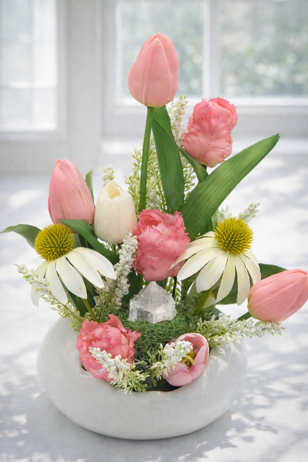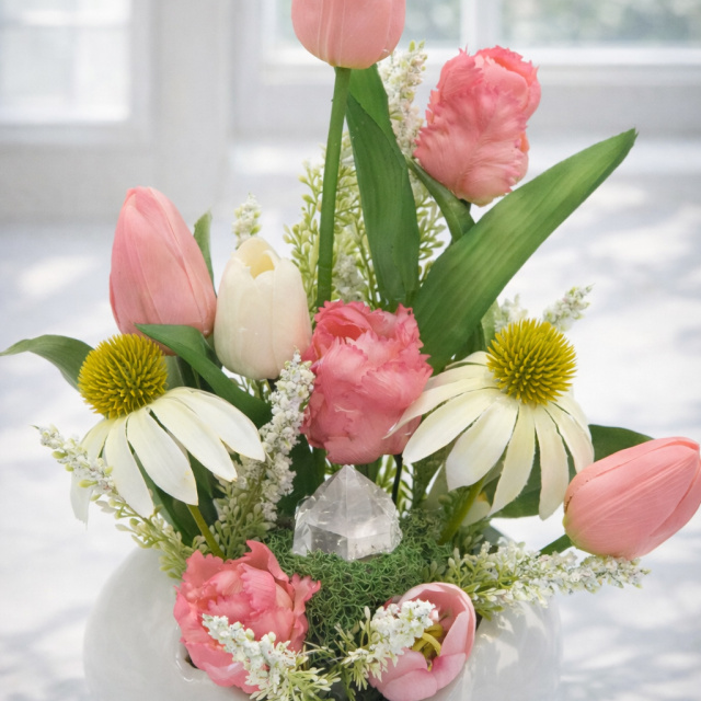 A Tündérkert kompozíció egy apró, mesés hangulatú tavaszi virágkert, ahol a finom rózsaszín tulipánok és a légies virágok játékosan emelkednek a zöld levelek közül. A kompozíció könnyed és friss hangulata a tavasz üde energiáját és a természet ébredésének szépségét idézi meg.