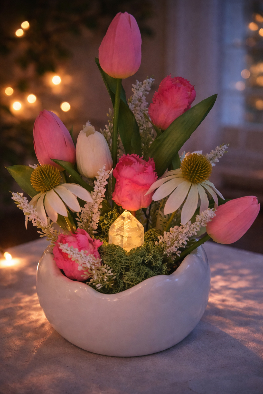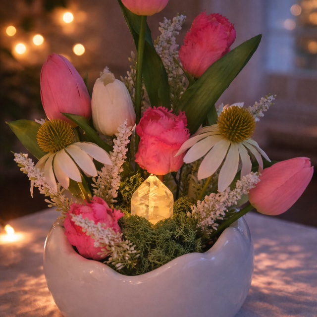 A virágok között megbújó girasol ásvány különleges, opálos ragyogásával teszi igazán egyedivé a kompozíciót. Az ásvány gombnyomásra kivilágítható. Lágy fényben dereng, amely még varázslatosabbá teszi a díszt.