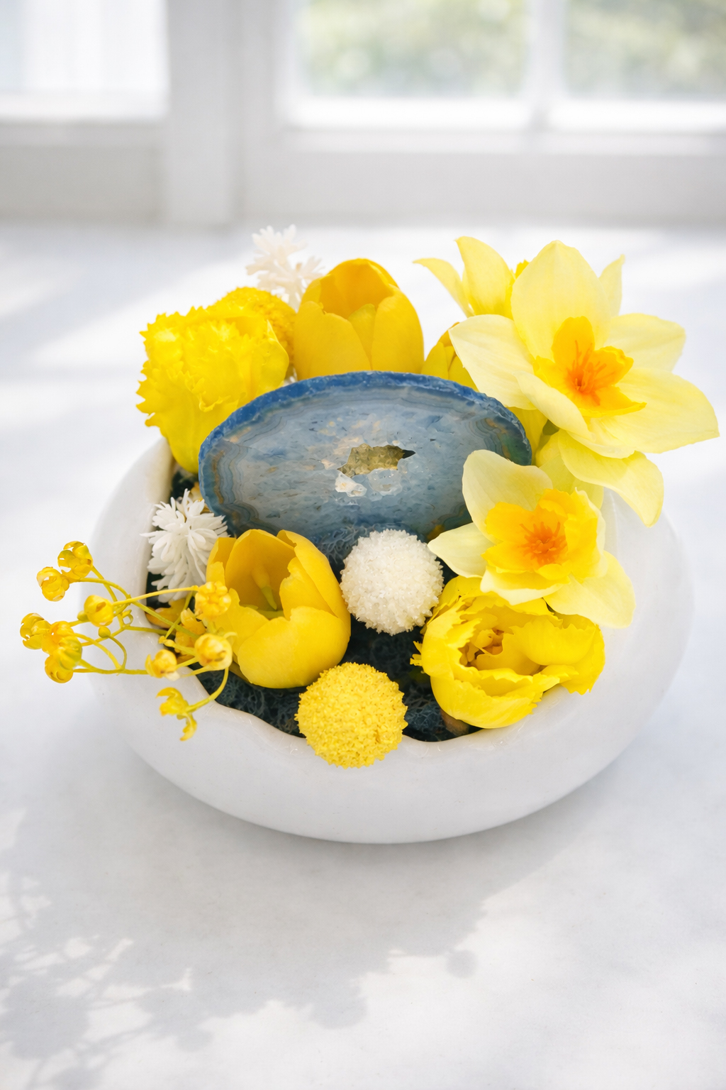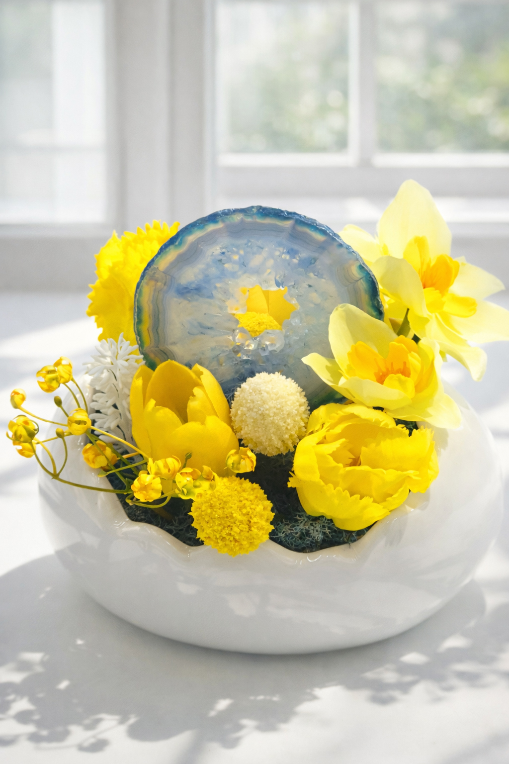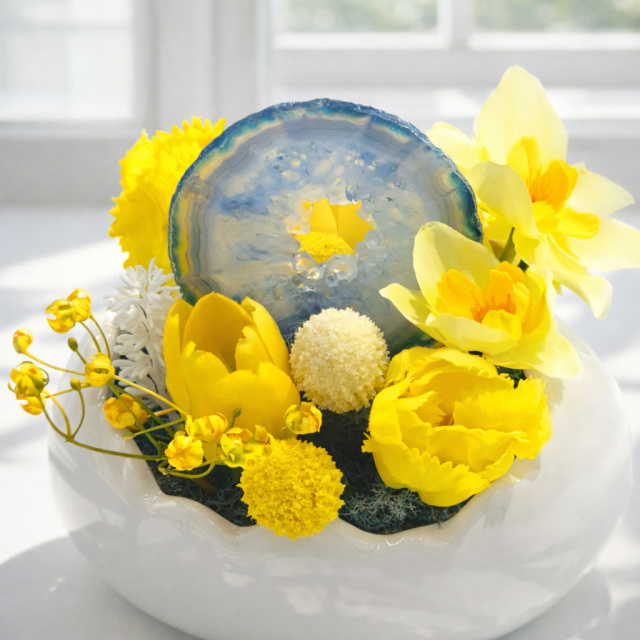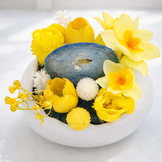 A kompozíció központi eleme egy különleges, áttetsző kék achát lap, amely a harmonikus energiákat szimbolizálja. A napsárga örökvirágok és a lágy pasztell árnyalatok együttese a tavasz első meleg napjait idézi meg.