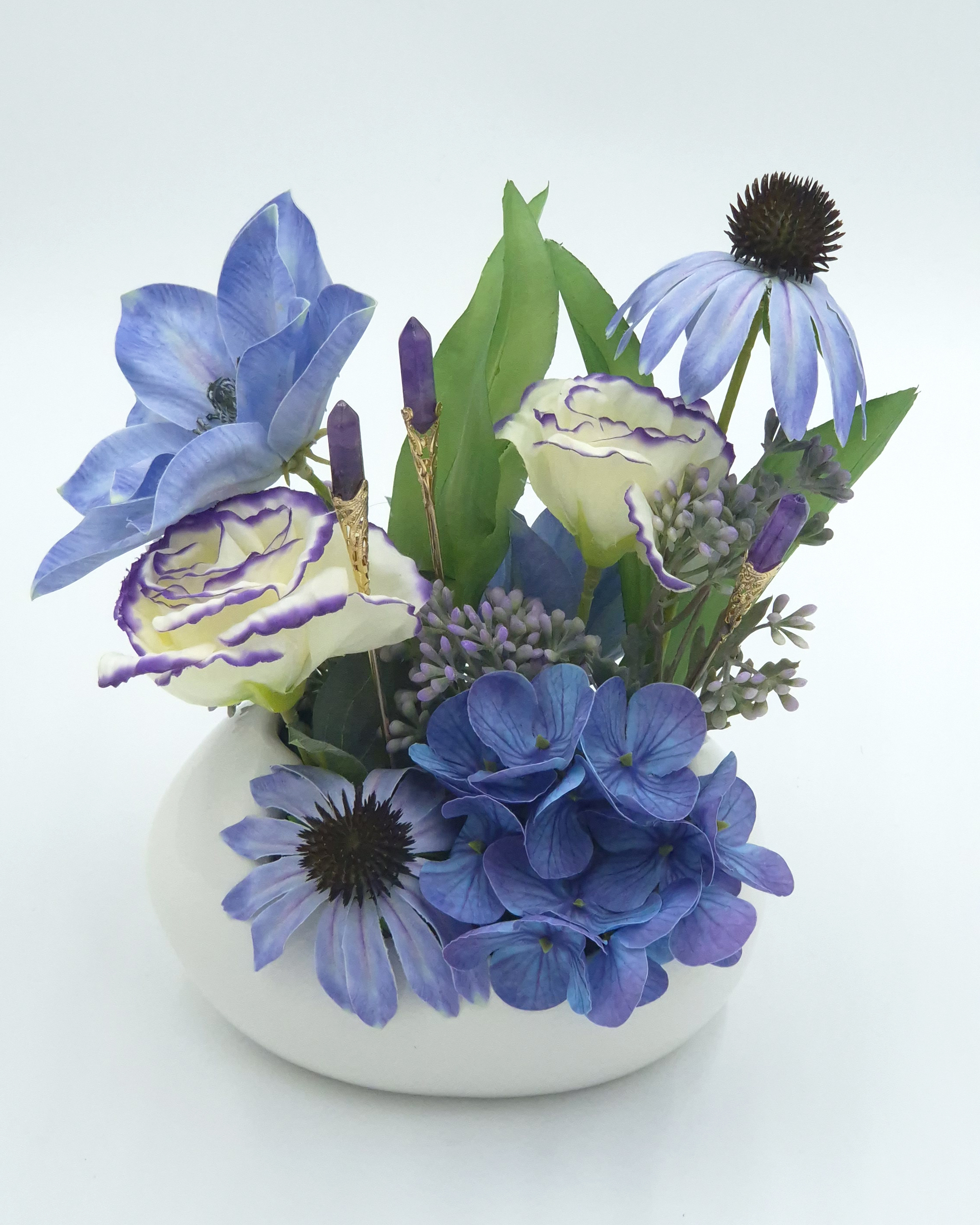 Az örökvirág kompozíció középpontjában 3 ragyogó ametiszt kristály áll, amelyet kék és lila árnyalatú virágok vesznek körül. A kompozíció elegáns és nyugtató színvilága a tavasz frissességét és a belső békét idézi.