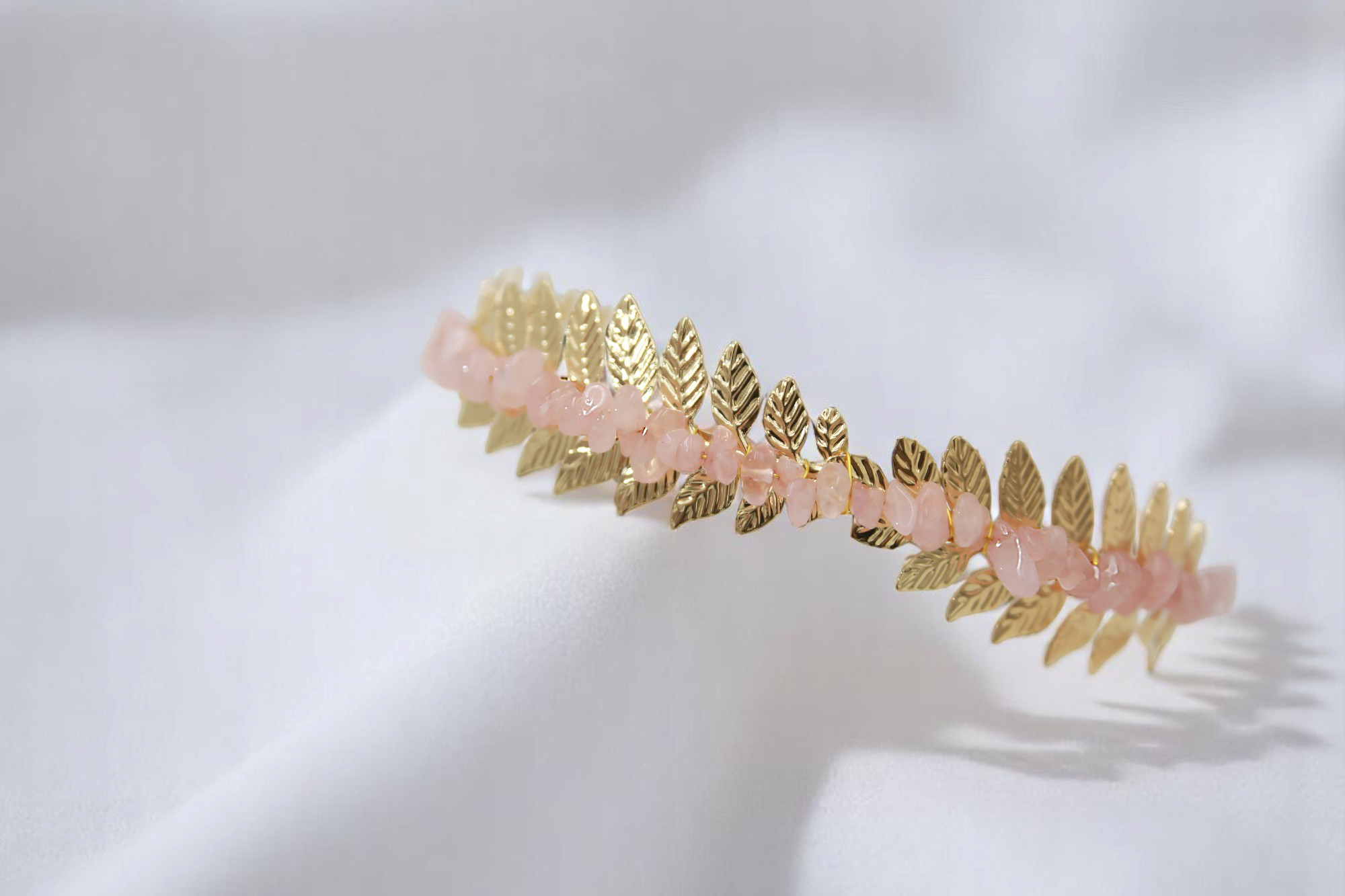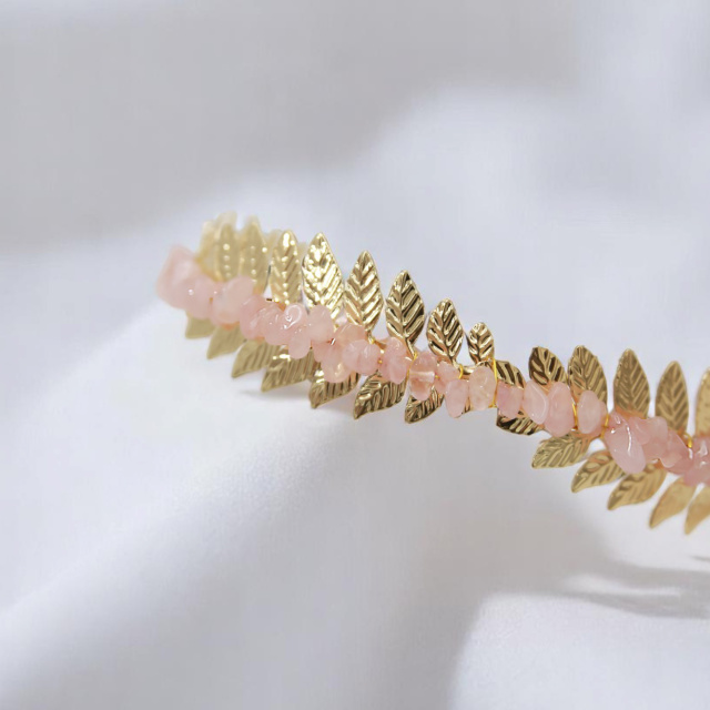Az Auralevél hajdísz a természet ihlette elegancia és a rózsakvarc lágy energiájának tökéletes ötvözete. Aranyszínű, finoman formázott levelek között simulnak meg a szeretet kristályának halvány rózsaszín fényei – mintha maga a hajnal érintette volna meg őket.