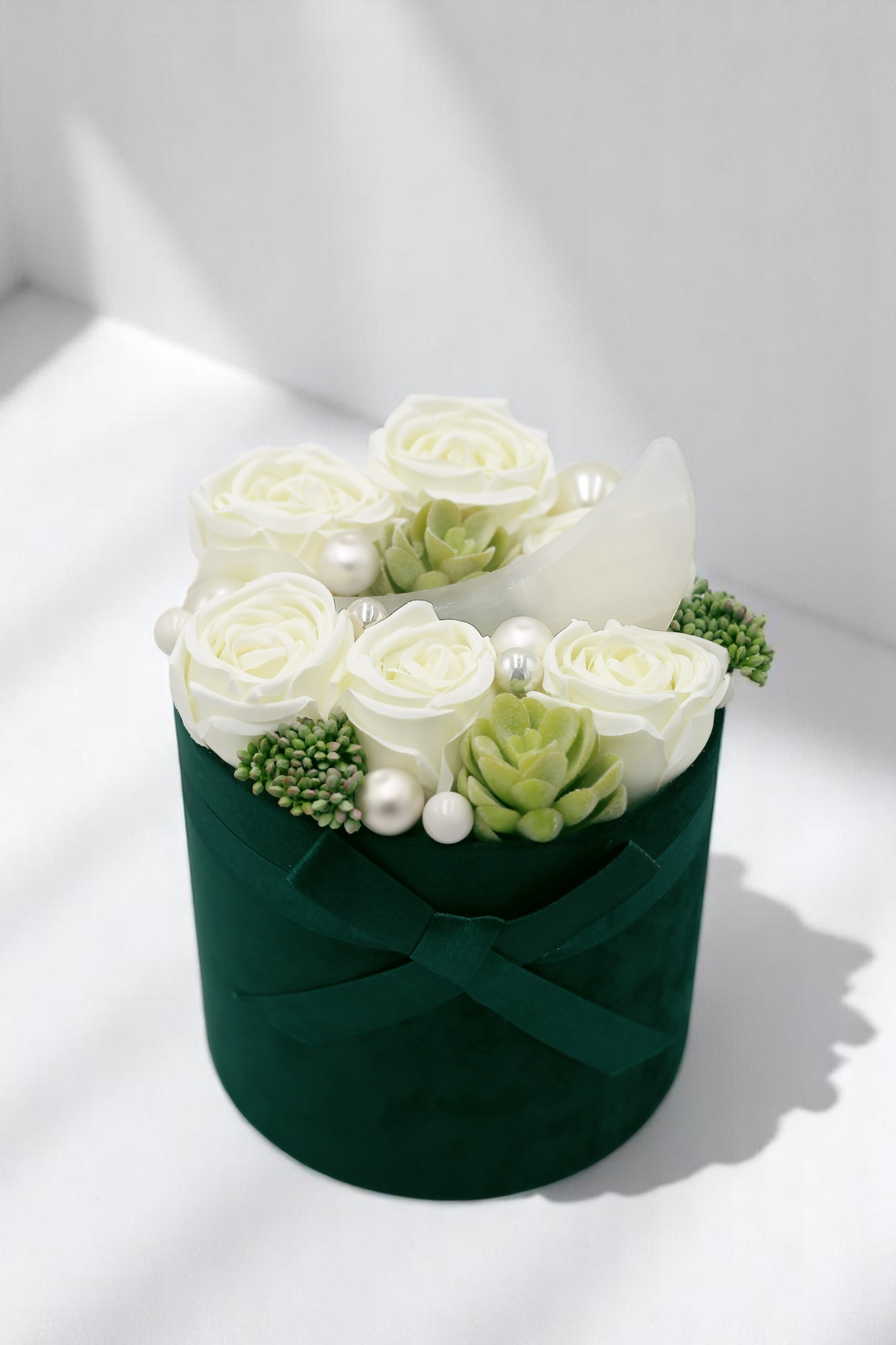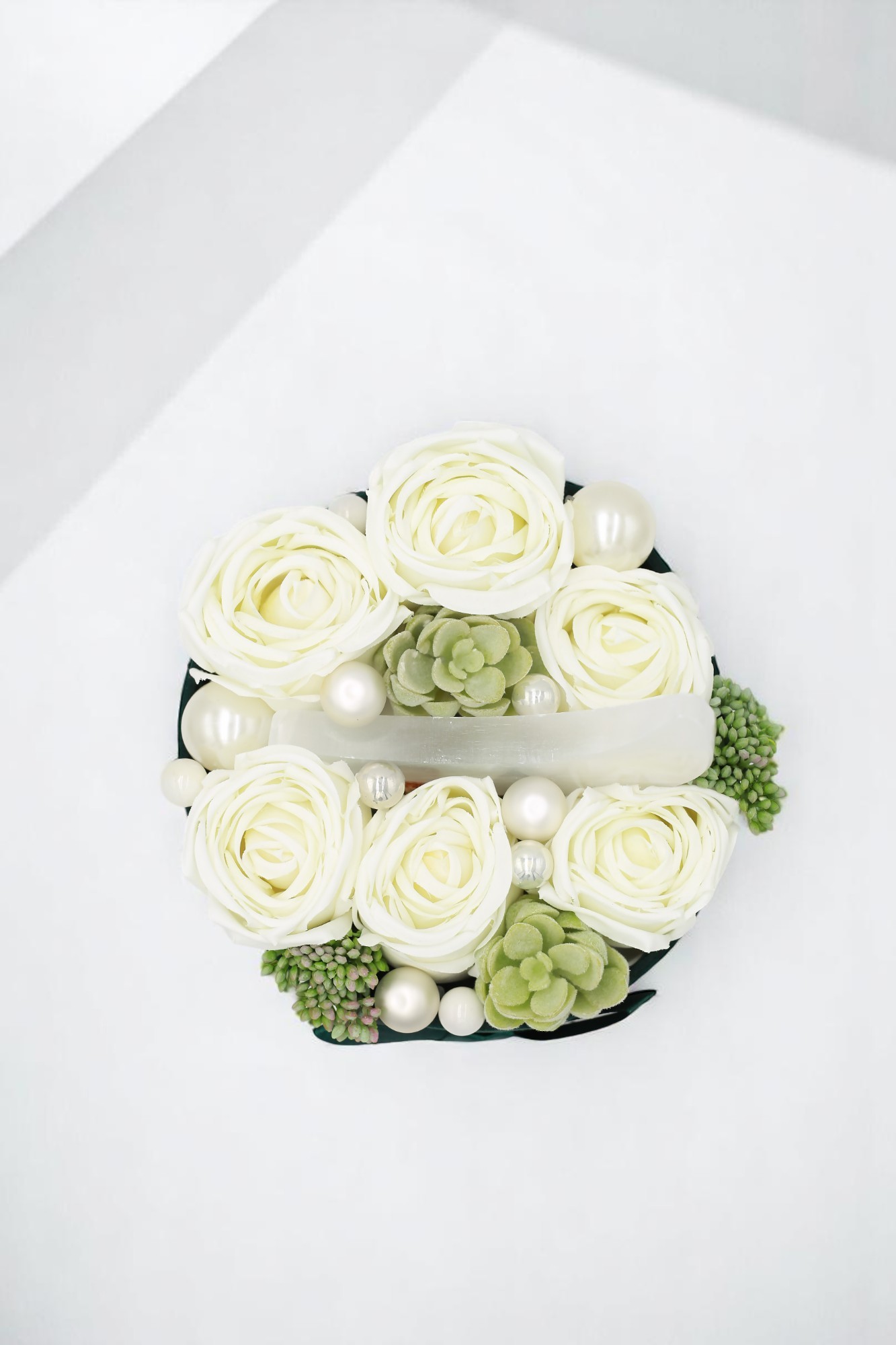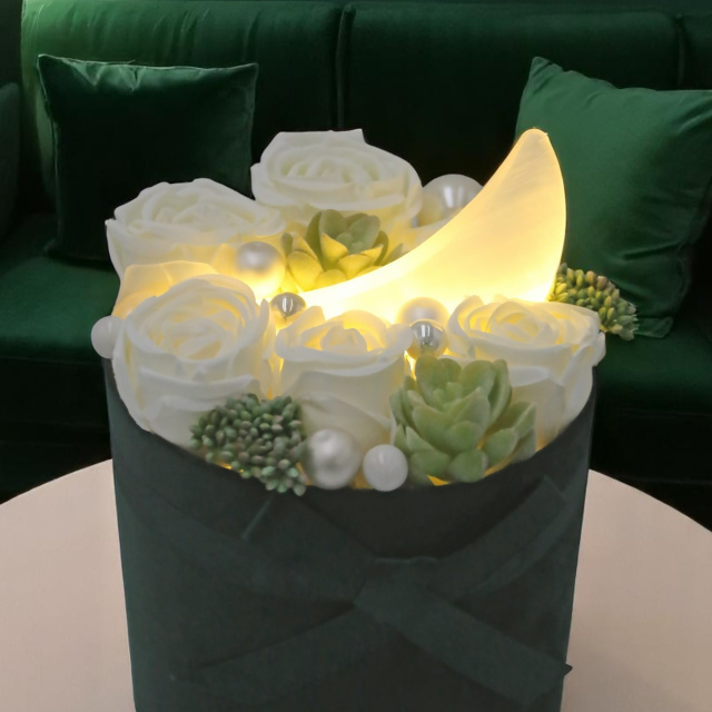 A Holdkert egy békét sugárzó, friss és elegáns kompozíció fehér rózsákkal, élethű pozsgásokkal és gyöngy díszekkel, melyet a középpontban elhelyezett kivilágítható szelenit félhold tesz teljessé. A szelenit a tisztaság és a belső béke kristálya, mely segíthet megtisztítani a tér energiáját és támogatni a nyugodt jelenlétet.