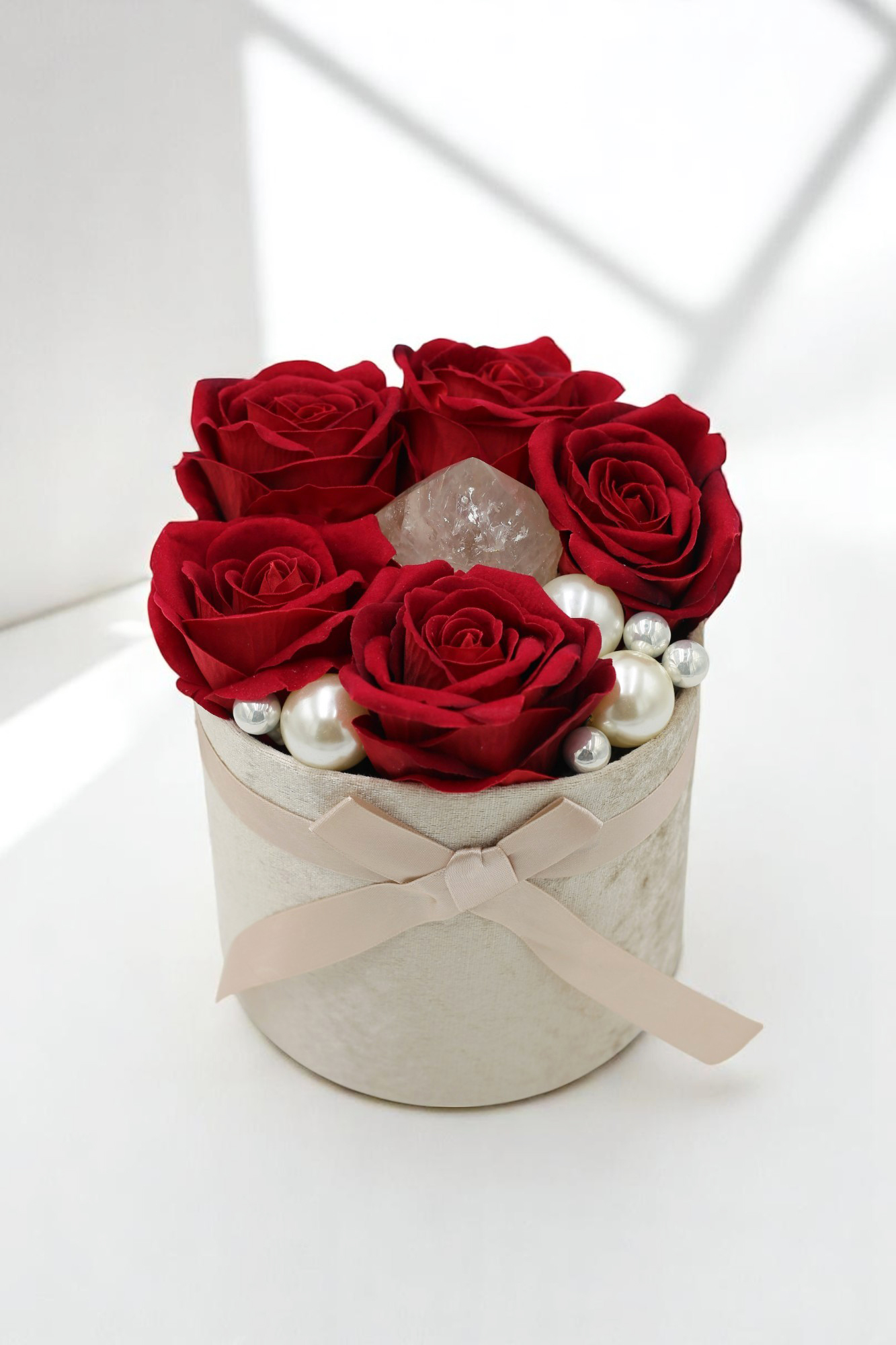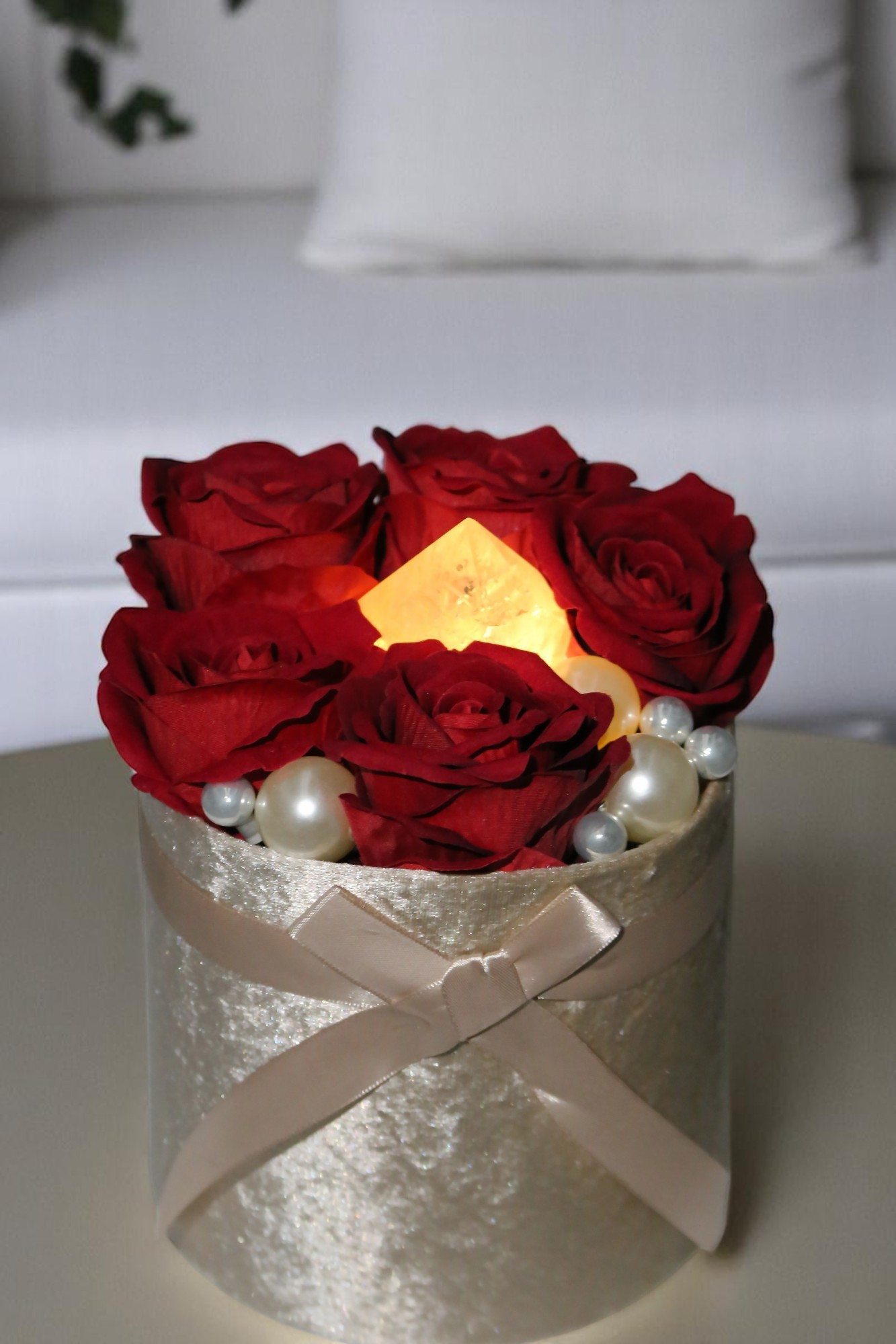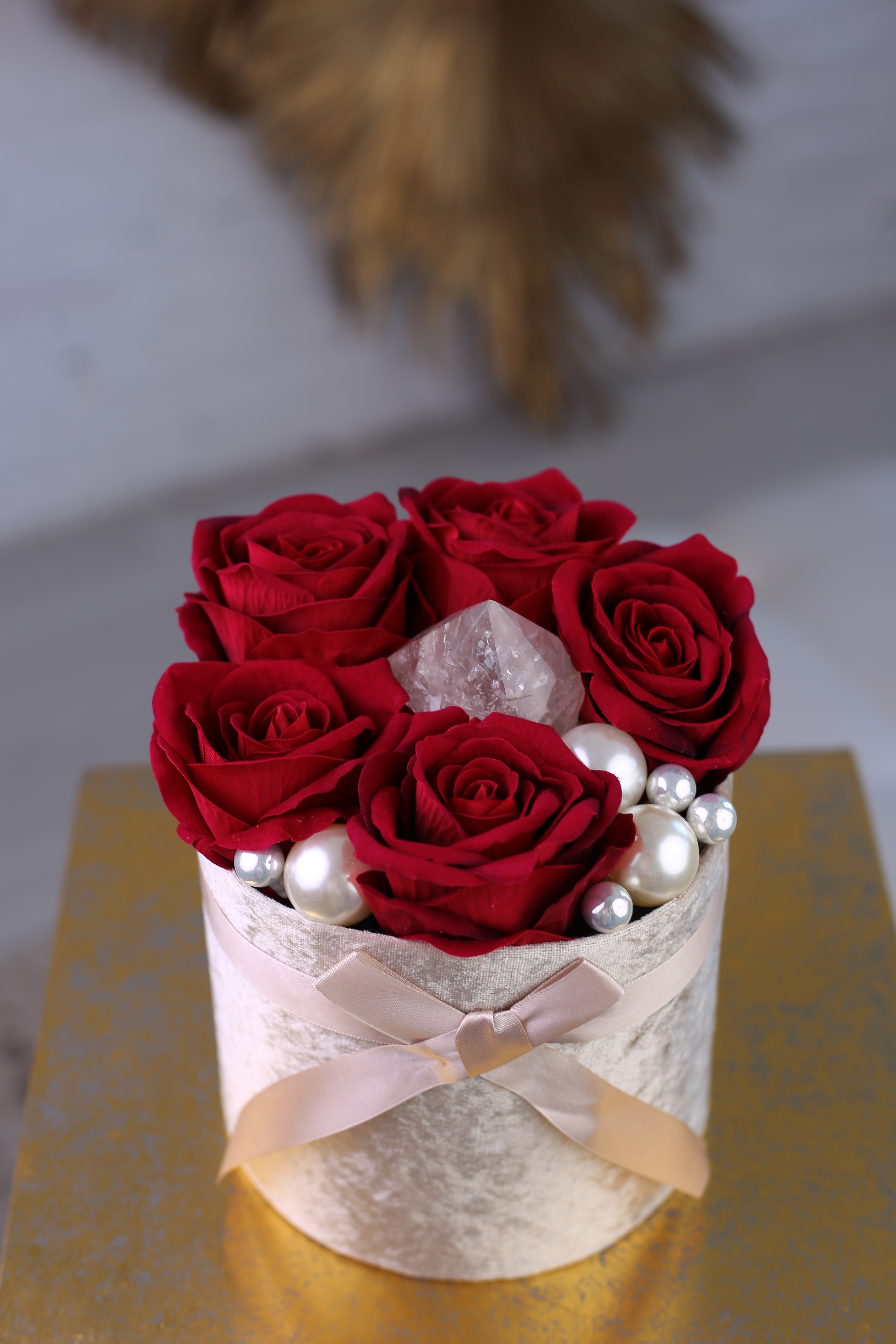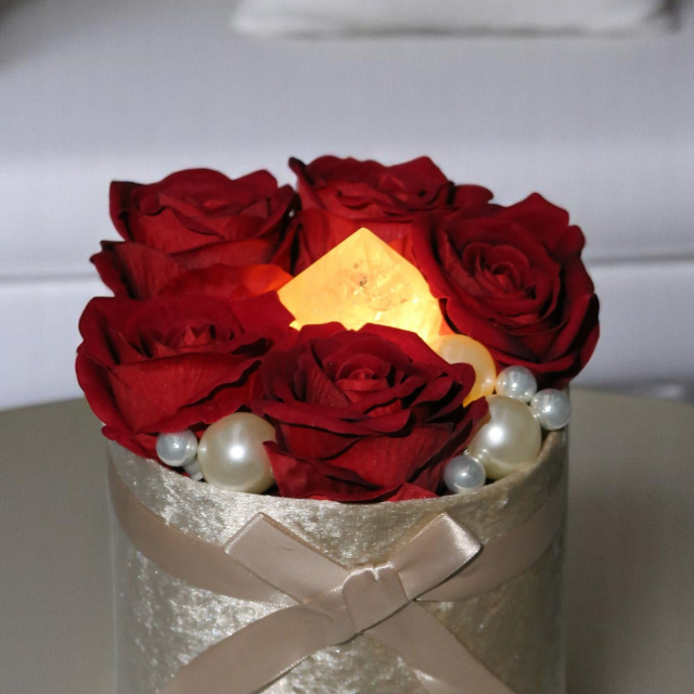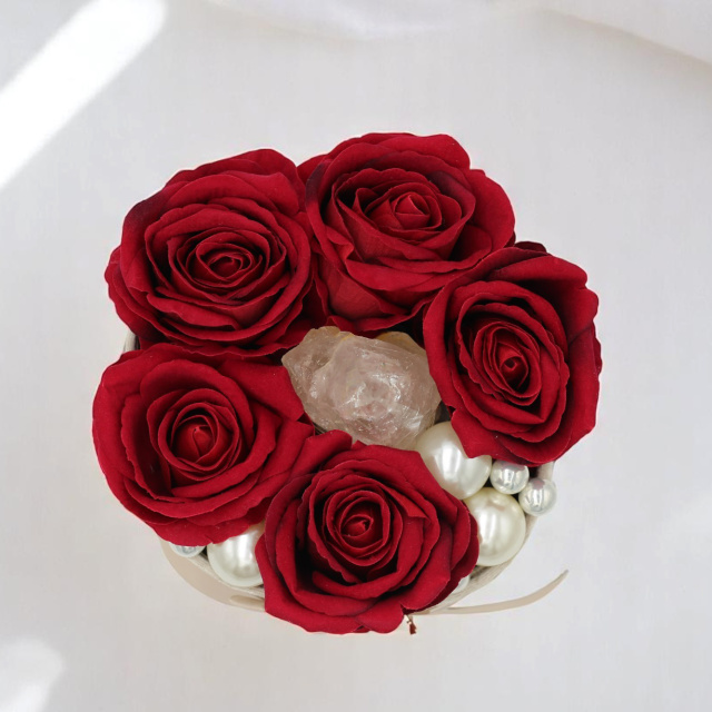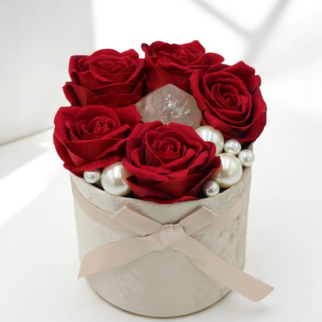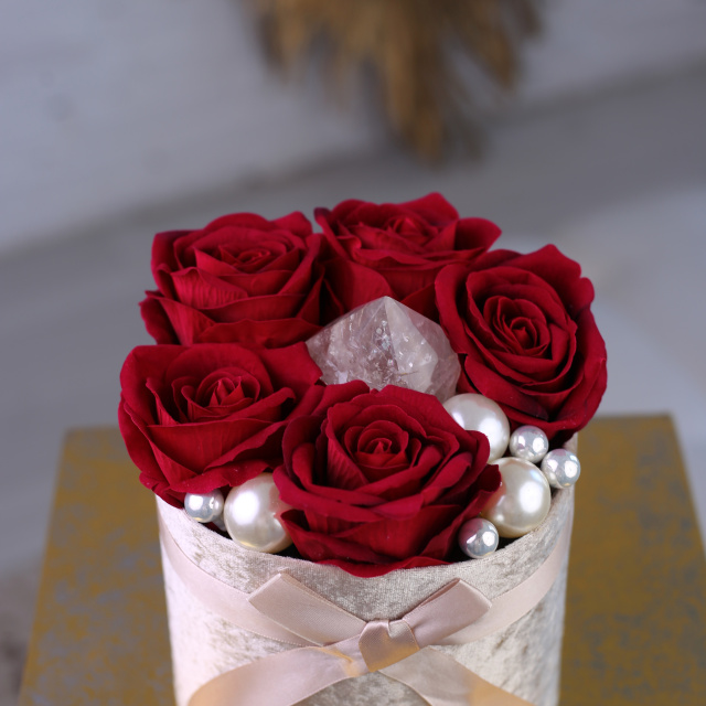 Ez a virágbox a szerelem és a belső ragyogás szimbóluma. A mélyvörös rózsák szenvedéllyel és eleganciával ölelik körül a középpontban elhelyezett kivilágítható girasol kristályt, amely puha, gyöngyházfényű derengésével a lélek csendes táncát idézi.