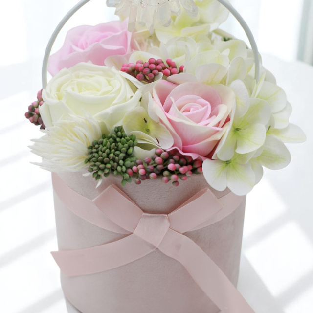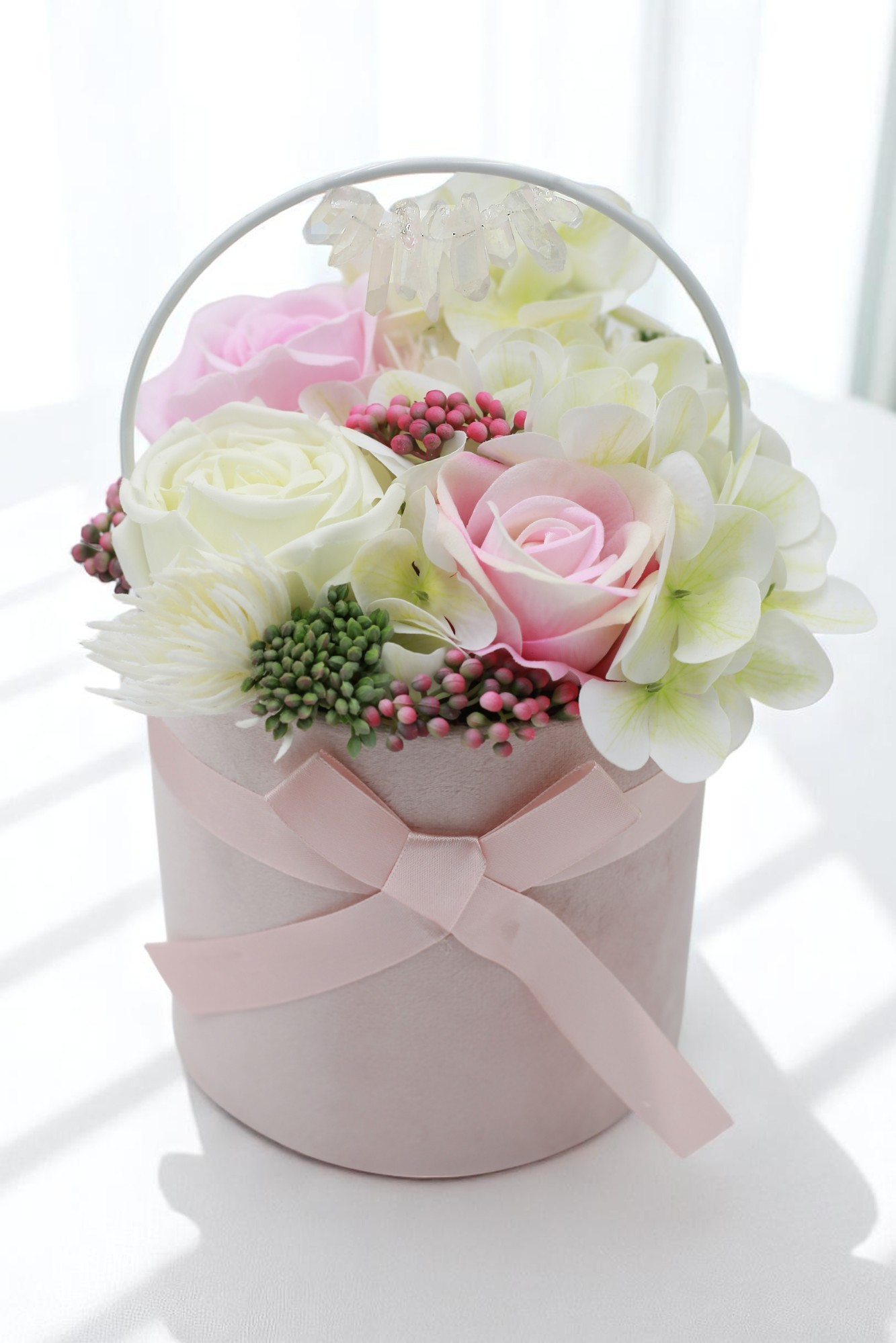 Az "Auraív" egy letisztult, mégis varázslatos hangulatú virágbox, amelyben a puha rózsaszín és fehér rózsák, hortenziák, apró pozsgások és bogyók finoman ölelik körbe a doboz közepét. A kompozíció igazi különlegessége a beépített karika, amelyre csillogó aurakvarc csúcsok fűzve ívelnek – mintha egy lebegő fénykoszorú hajolna a virágok fölé.