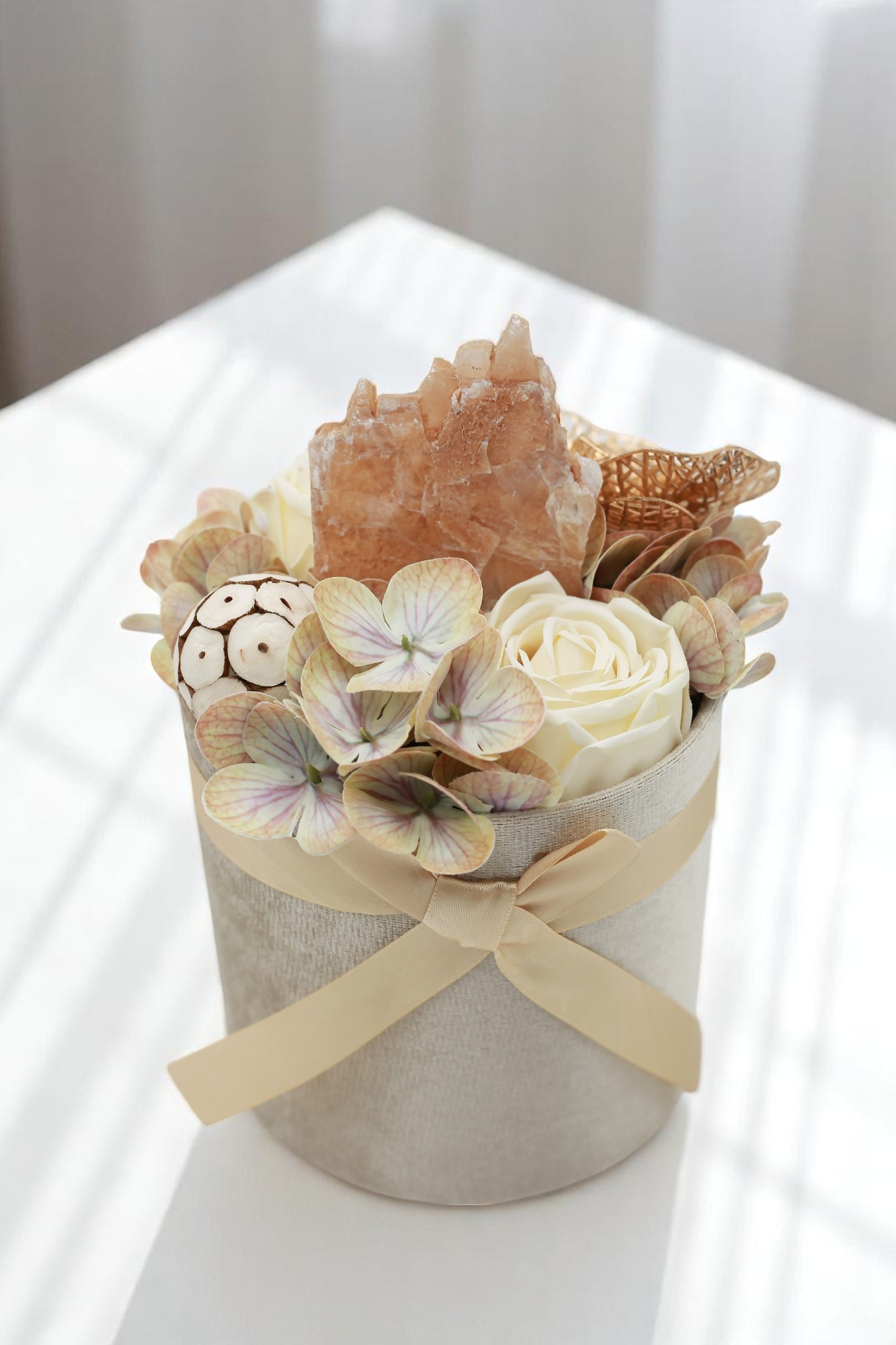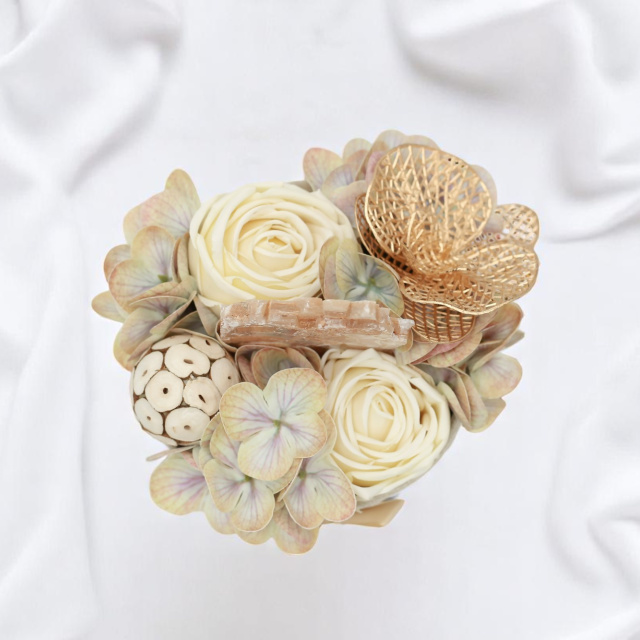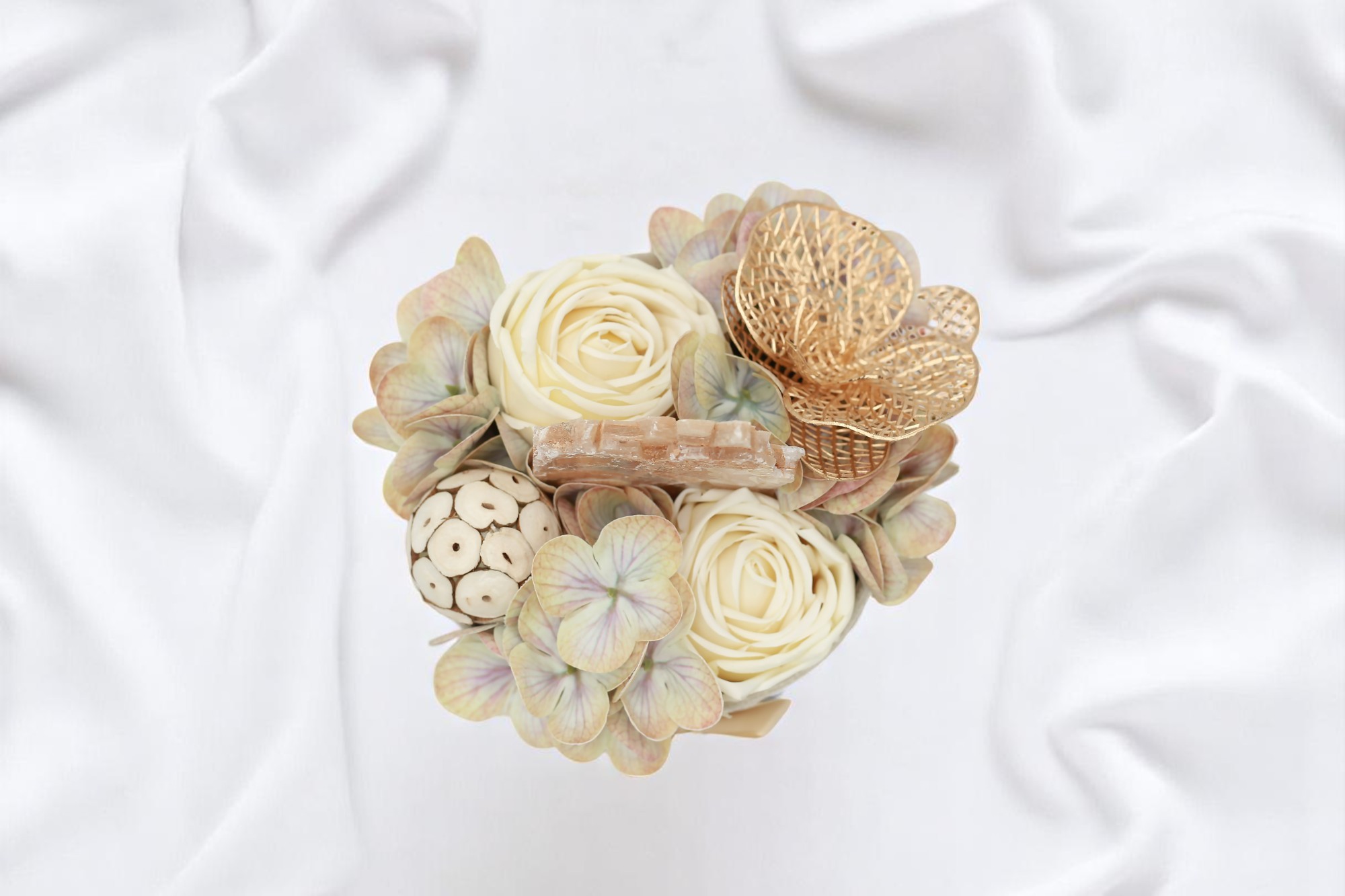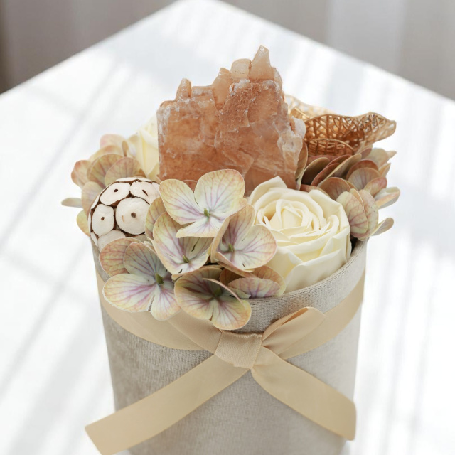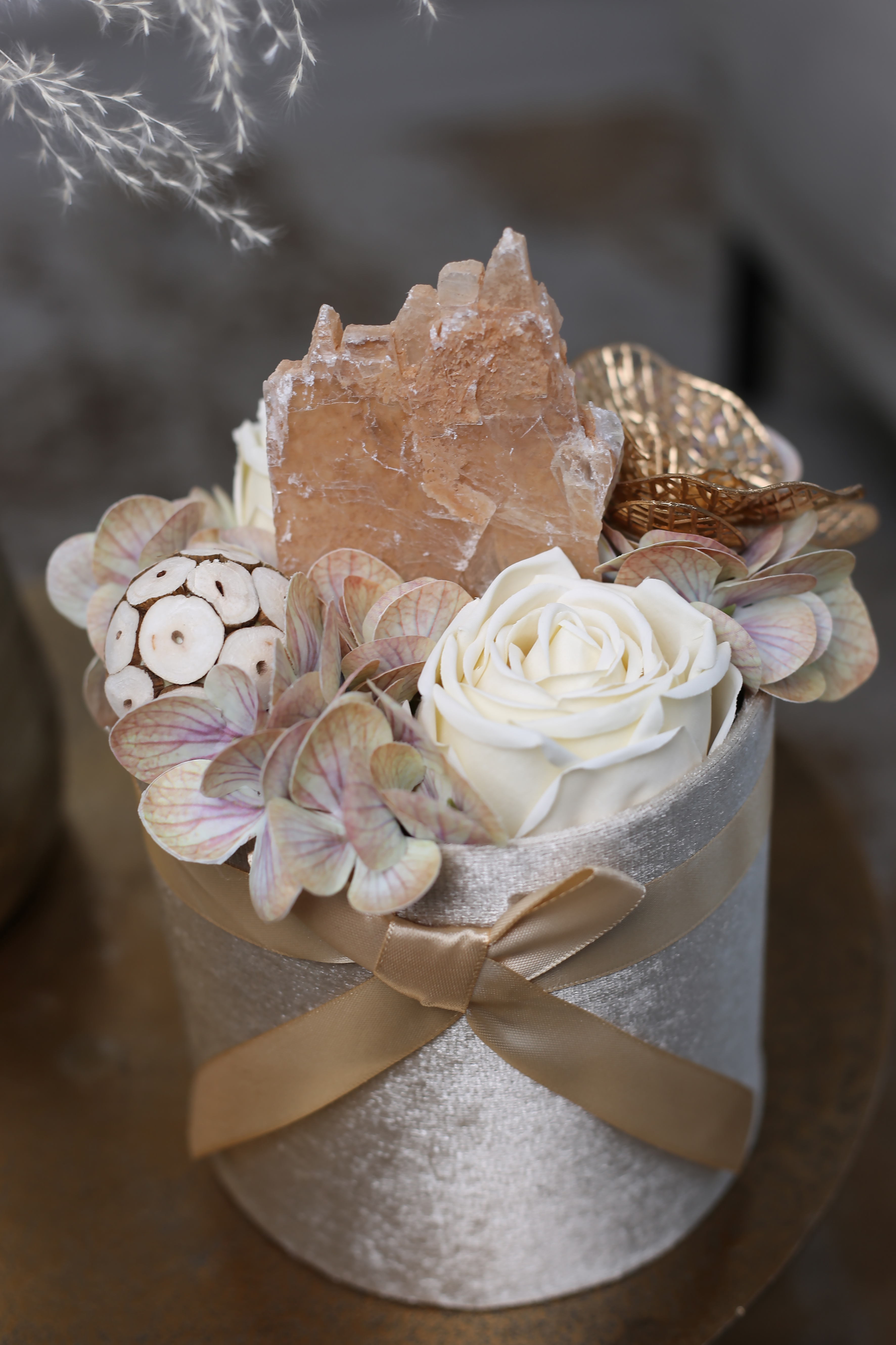 A "Föld Energia" természetközeli, mégis elegáns kompozíció, amely a nyugalmat és a földből áradó energiát ötvözi. Krémszínű selyemrózsák, pasztell hortenzia és különleges, aranyfényű orchidea ölelik körbe a kompozíció szívét: egy nyers szelenit kristályt, amely méltósággal emelkedik ki a virágok közül.