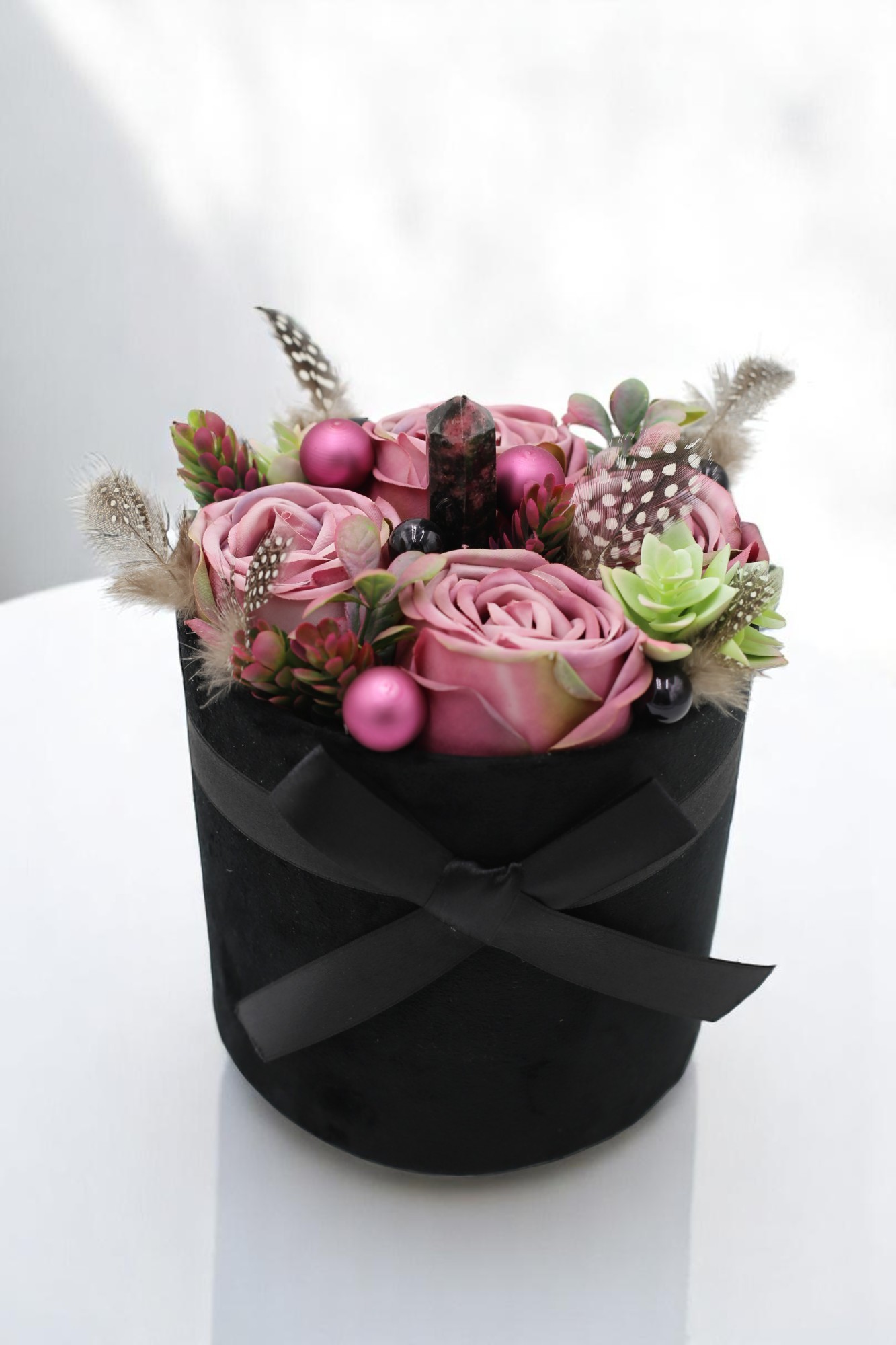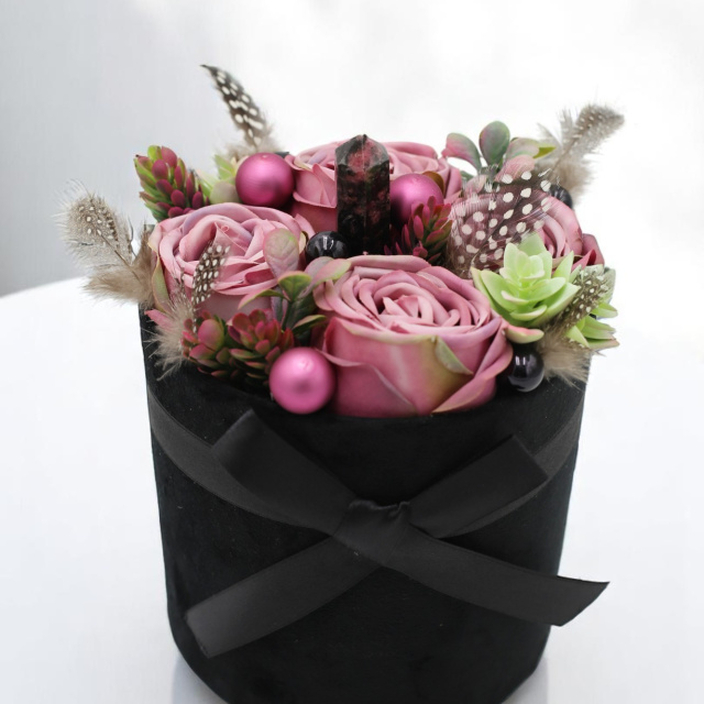 A „Rezdülés” virágbox egy különleges, modern kompozíció, amely ötvözi a romantikát, a játékosságot és a belső stabilitást. A púderrózsaszín selyemrózsák lágy eleganciáját apró tollak, különleges pozsgások és modern gömbdíszek egészítik ki – mindez mély, sötét háttérben bontakozik ki, így még hangsúlyosabbá téve az összeállítást.