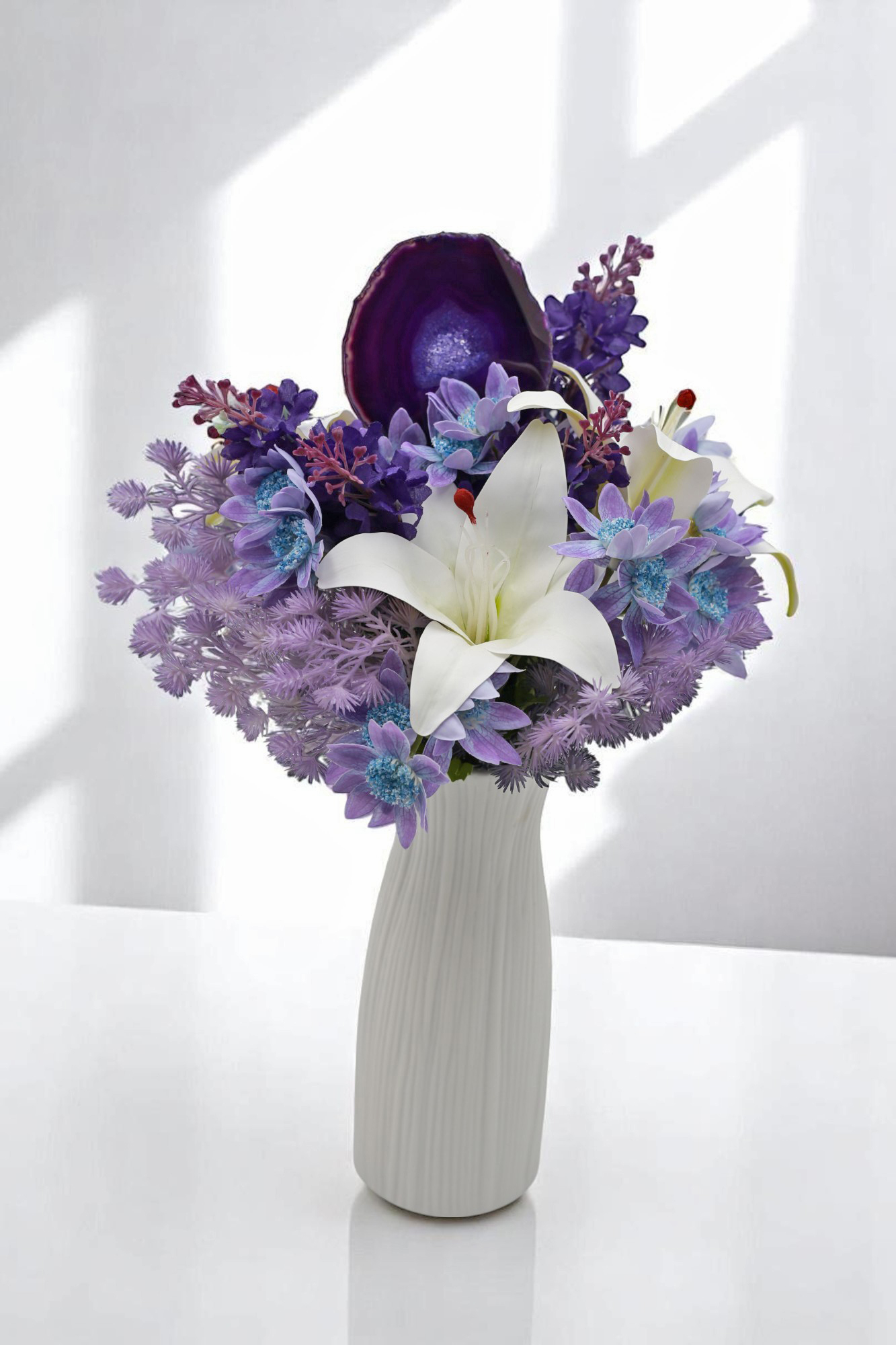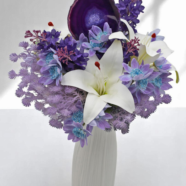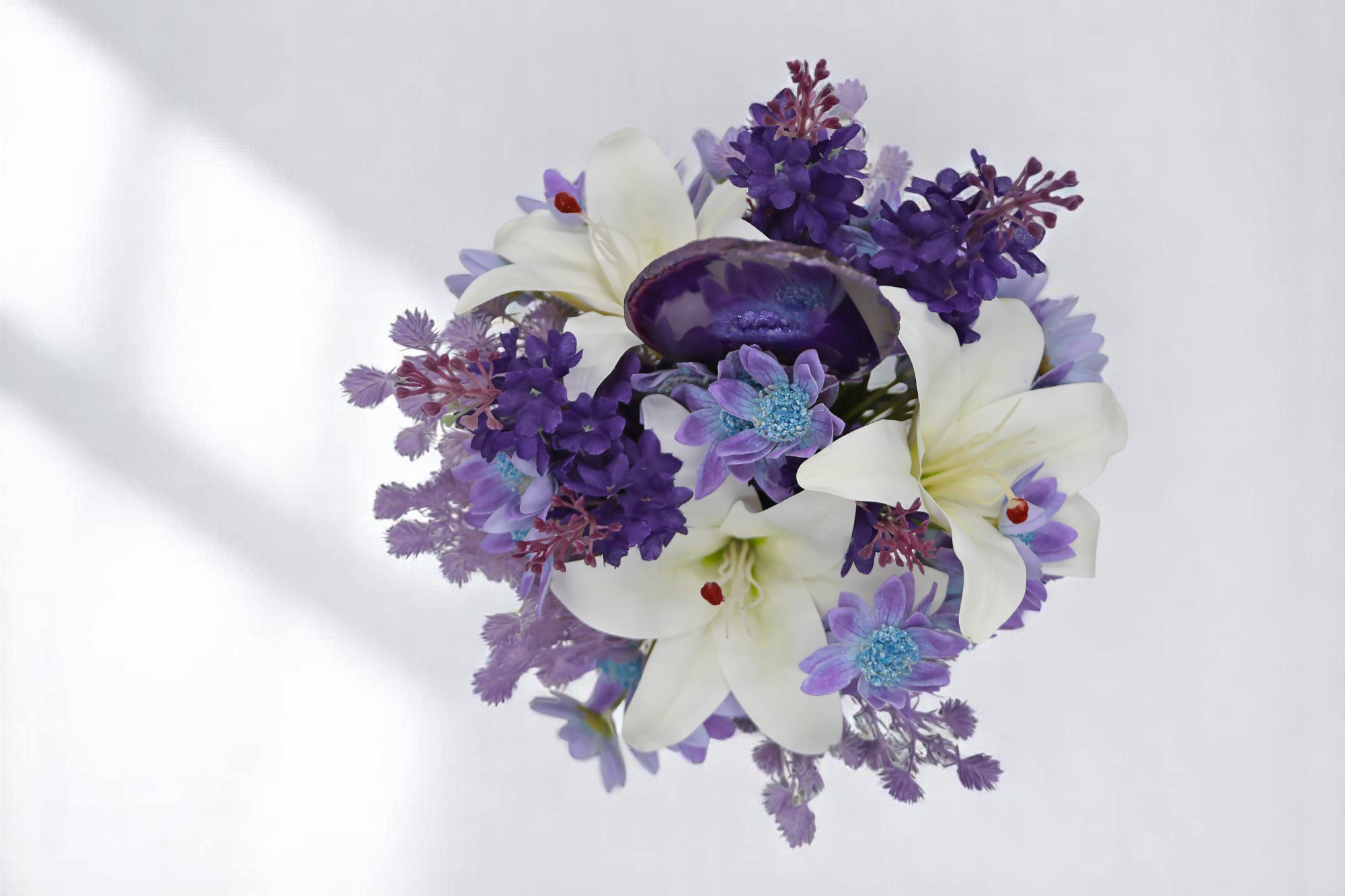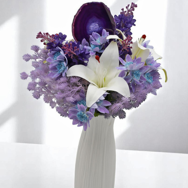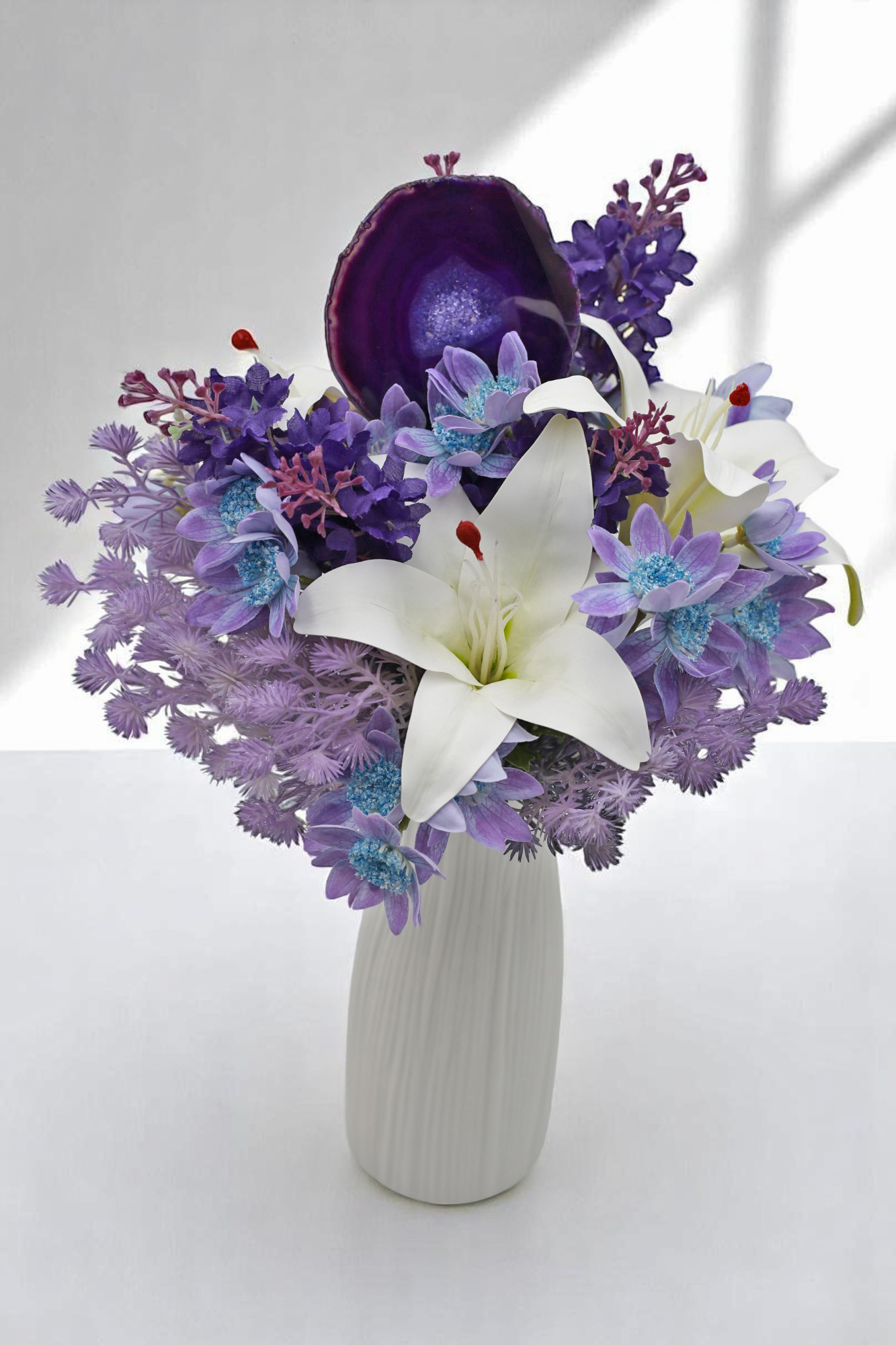 A lila mezei virágok játékos kontrasztot alkotnak a liliomokkal, megidézve Kate szabadságszeretetét, éles eszét és eleven lelkületét. A kompozíció közepén elhelyezett, csiszolt lila achát lap a nyugalmat, belső stabilitást és női erőt szimbolizálja – ez a kristály a méltóságteljes jelenlét és az érzelmi mélység köve.