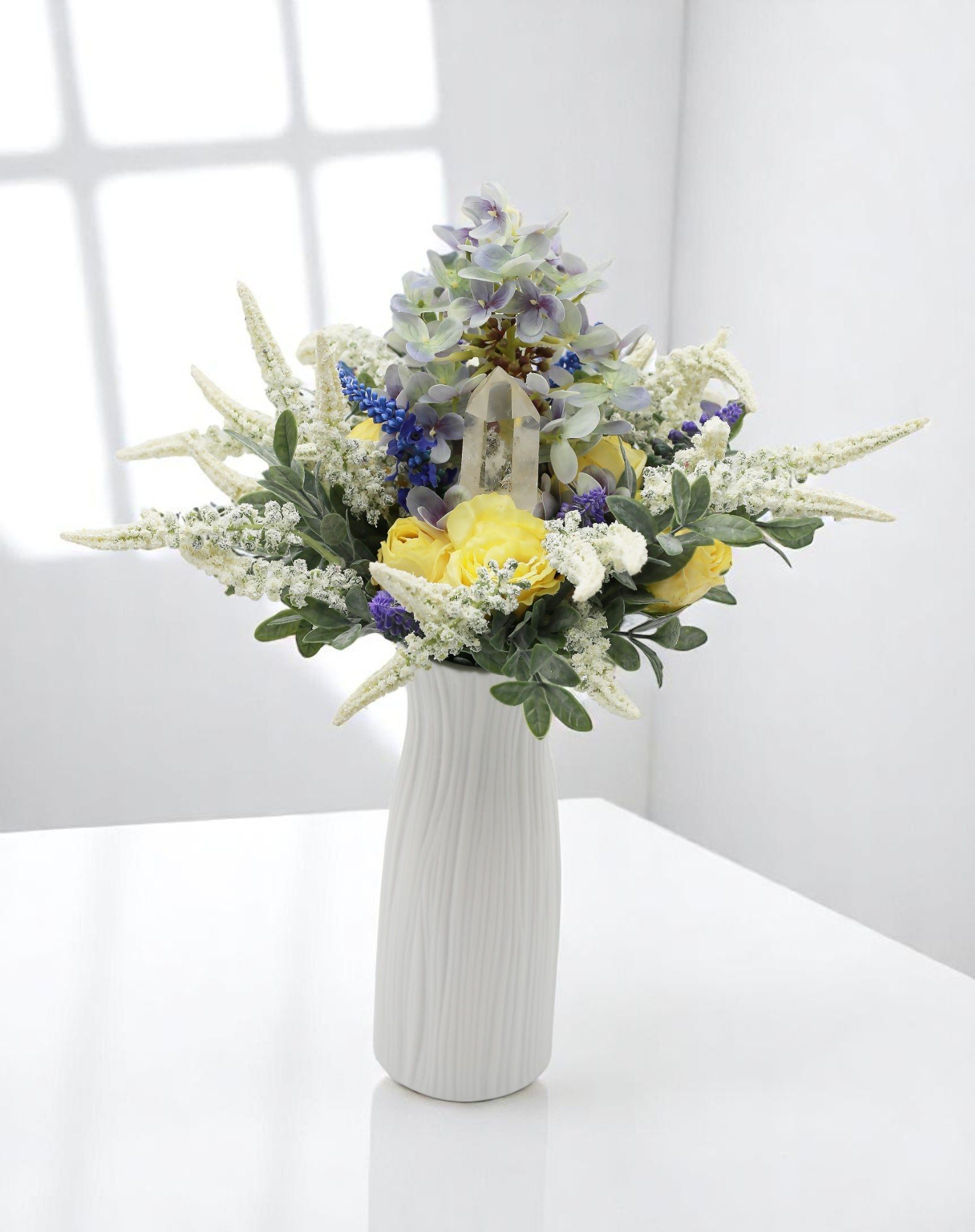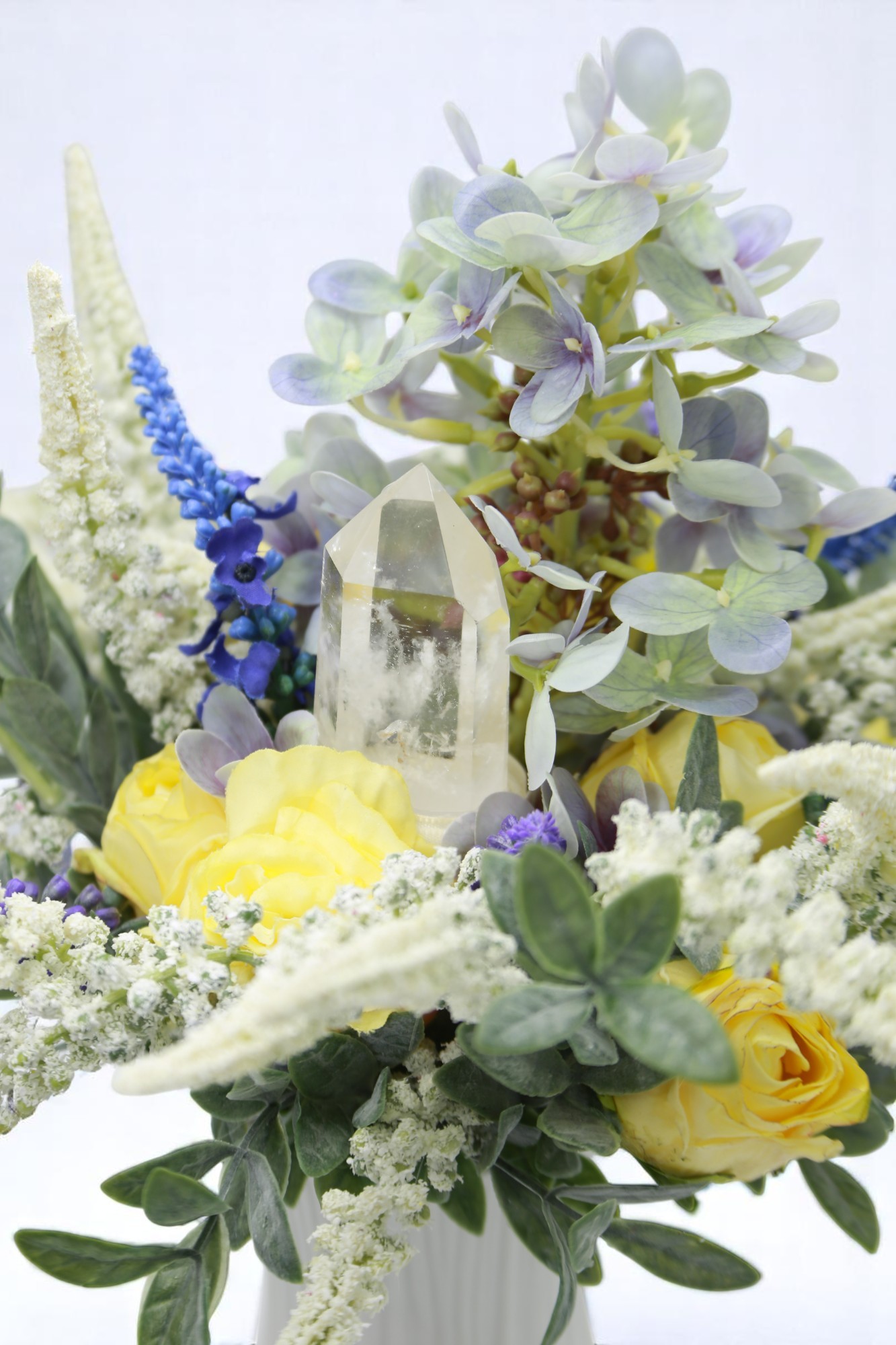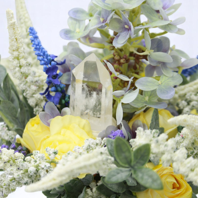 A csokor szívében egy hegyikristály kapott helyet, amely a tisztaság, önazonosság és belső fény szimbóluma. Olyan, mint Penelope igaz természete – őszinte, és erősebb, mint elsőre hinnénk.