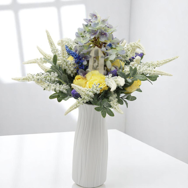A csokrot élénk, mégis elegáns sárga selyemrózsák, finoman illesztett akácágak és válogatott mezei virágok alkotják – mindez egy játékos, mégis kifinomult harmóniában.