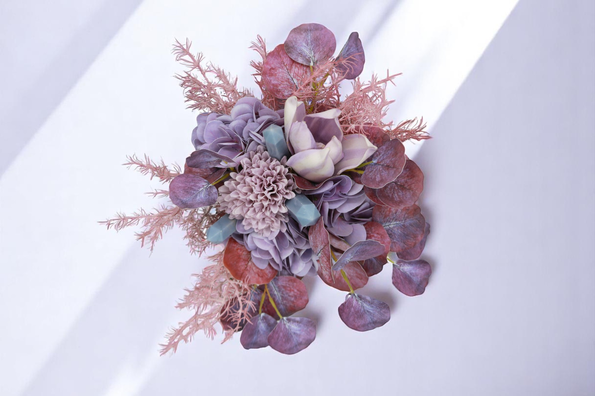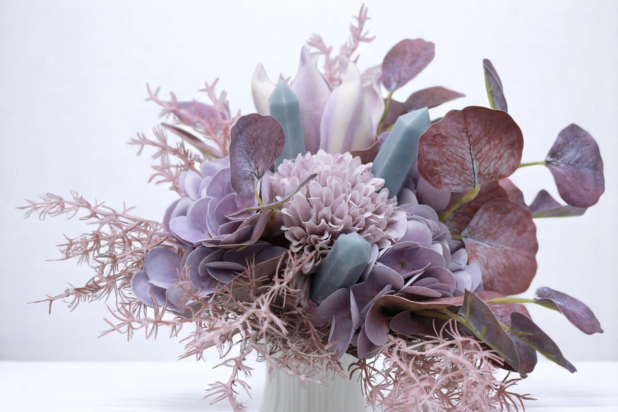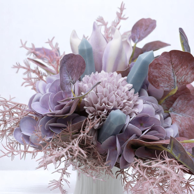 A kompozíció különlegessége a három világoskék angelit kristály, amely a béke, együttérzés és spirituális kapcsolódás köve. Szinte észrevétlenül simulnak bele a virágok közé, mégis egy mélyebb réteget adnak a csokor energiájának – mintha Violet halk jelenléte átszőné minden szirmát.