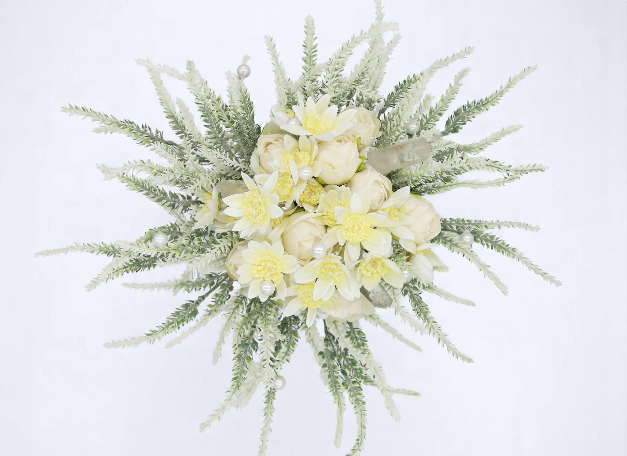 Három karcsú hegyikristály rúd emeli az összeállítást magasabb szintre – nemcsak látványban, hanem jelentéstartalomban is. A hegyikristály a tisztaság és tisztánlátás szimbóluma, Francesca lényének hű tükre. Az apró, diszkréten elhelyezett gyöngyök tovább mélyítik a kompozíció kifinomultságát: eleganciájuk az időtlen nőiességet idézi.