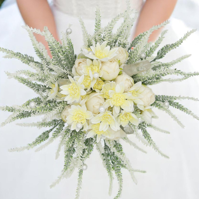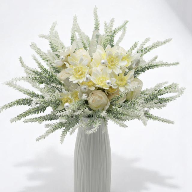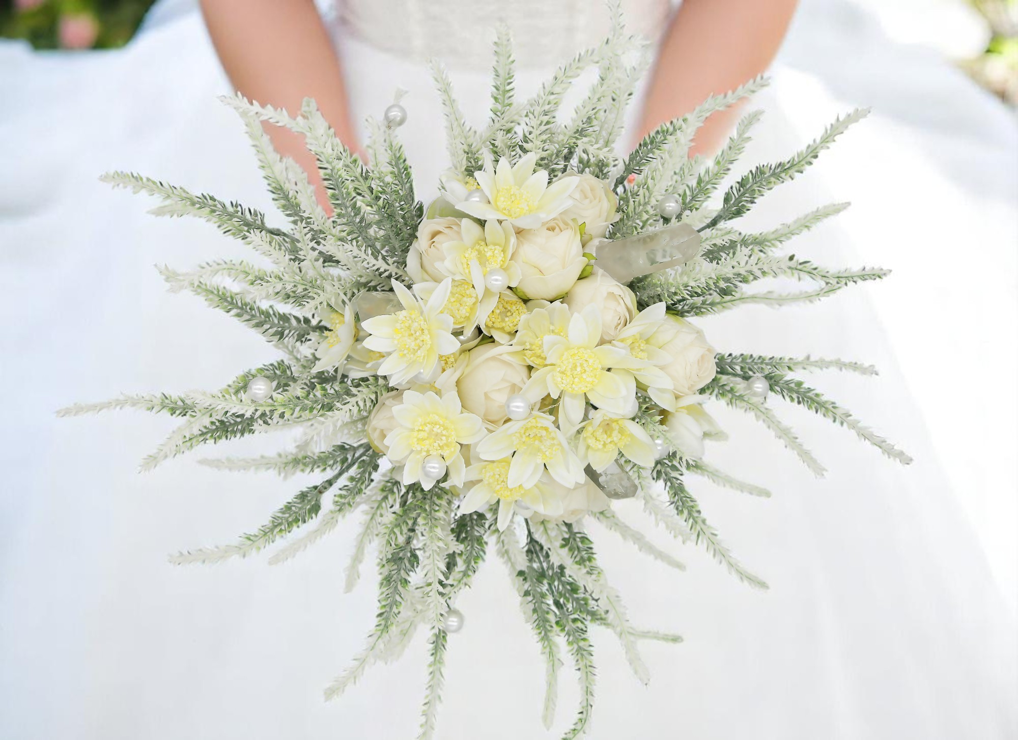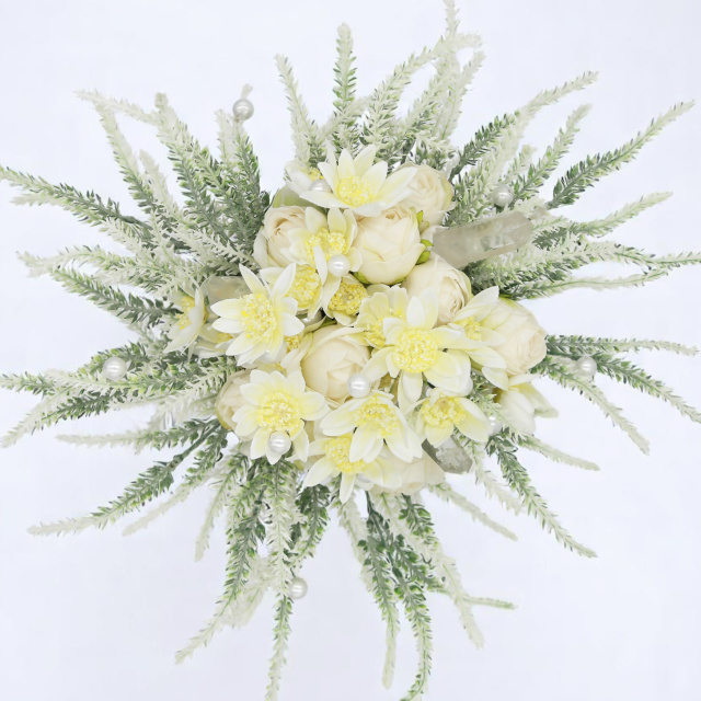 Finom fehér mezei virágokból készült, amelyek egyszerre idézik a természet tisztaságát és a visszafogott arisztokratikus bájt. Ez a csokor a harmónia, a nyugalom és a belső egyensúly ünneplése.