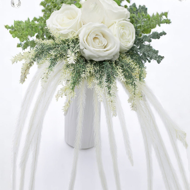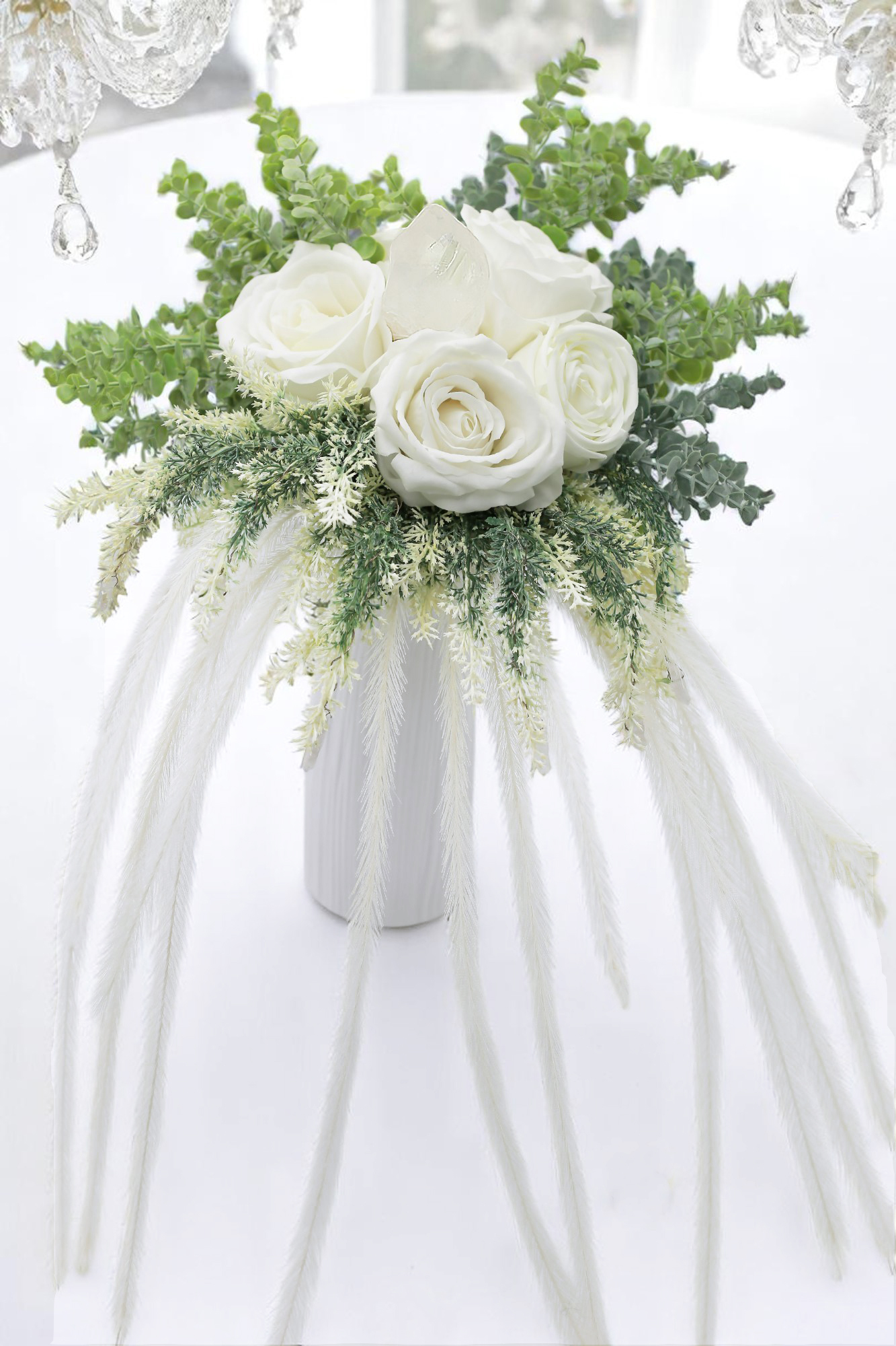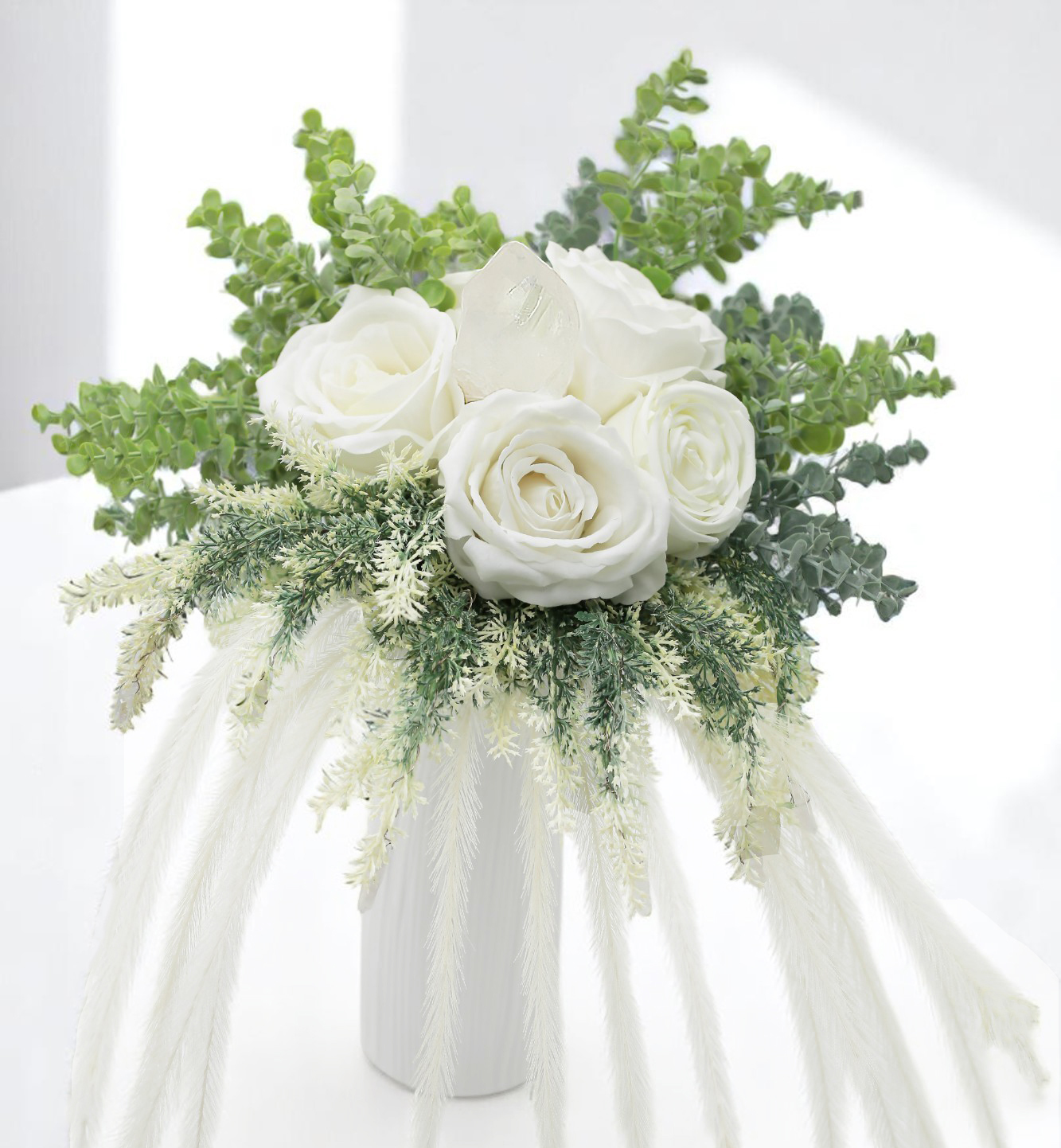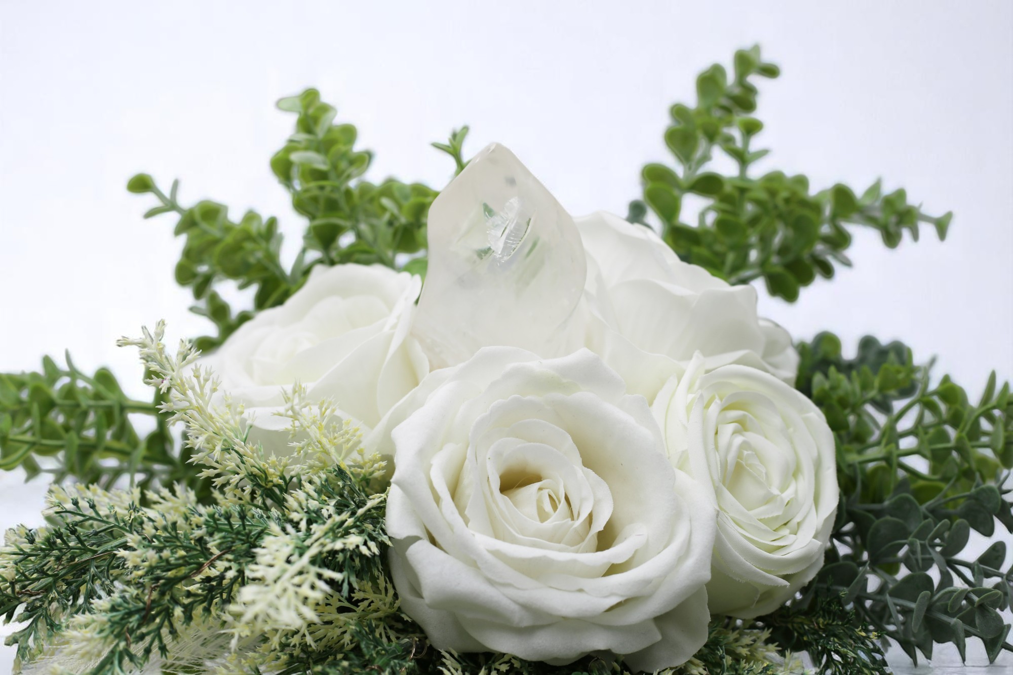 A „Daphne” – Bridgerton-inspirálta örökvirágcsokor fehér rózsákból áll, óriás Hegyikristállyal és Aurakvarcokkal.