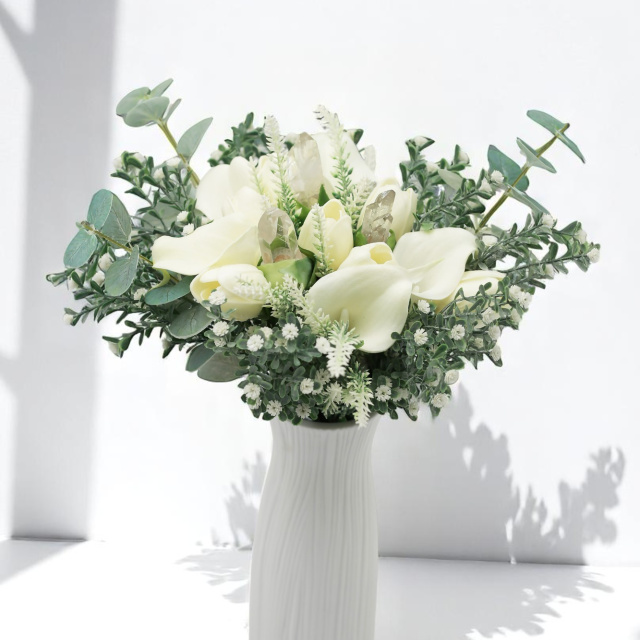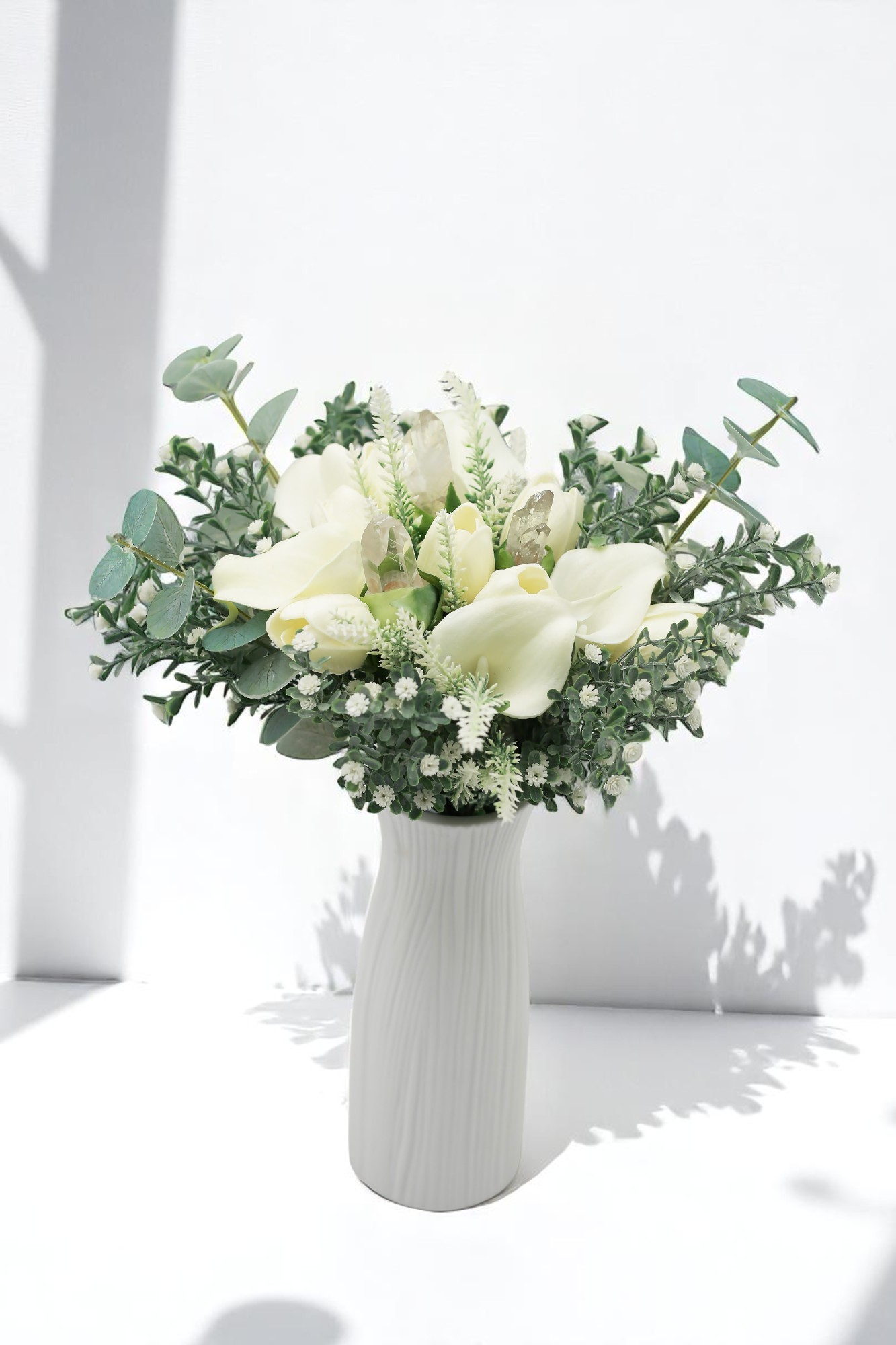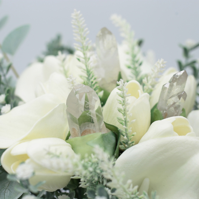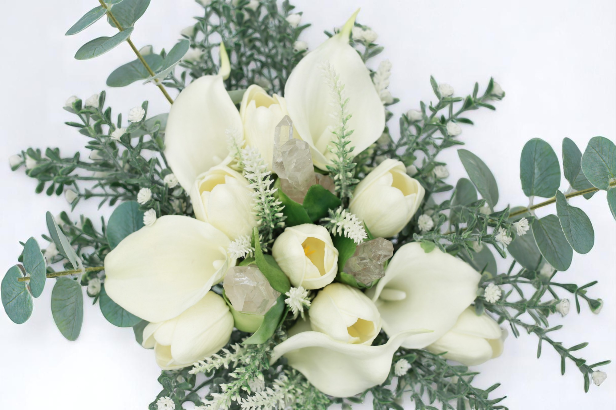 A „Fehér Energia” csokor a harmónia és az energiatisztítás megtestesítője. Friss, letisztult vonalvezetésű összeállítás, melyben fehér tulipánok és kálák lágy íveit eukaliptusz és apró fehér virágok zöldje egyensúlyozza ki. A kompozíció szívében három hegyikristály rúd emelkedik, mint fényoszlopok, melyek tisztítják a teret és a gondolatokat.