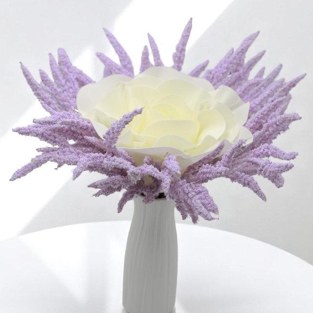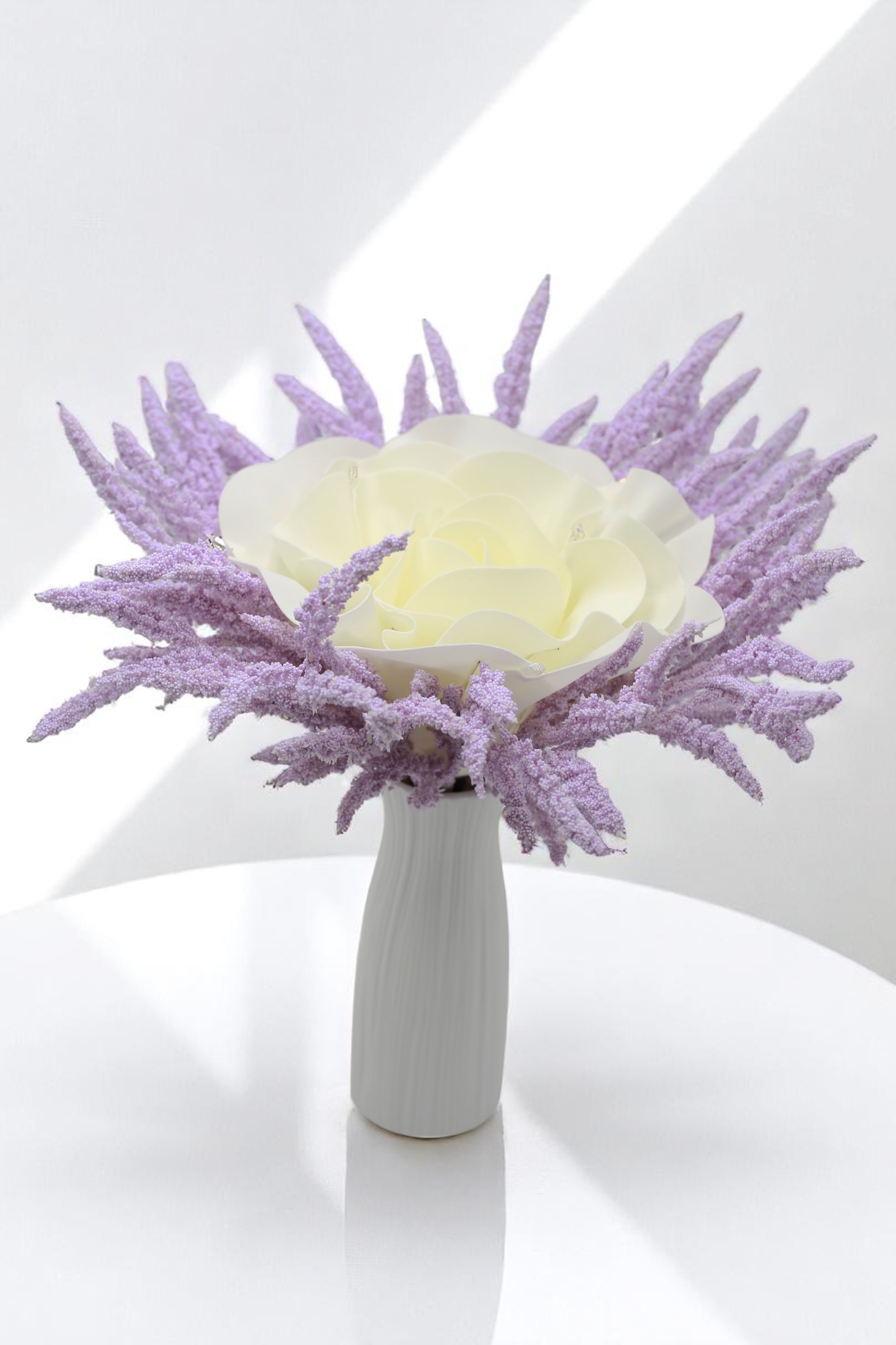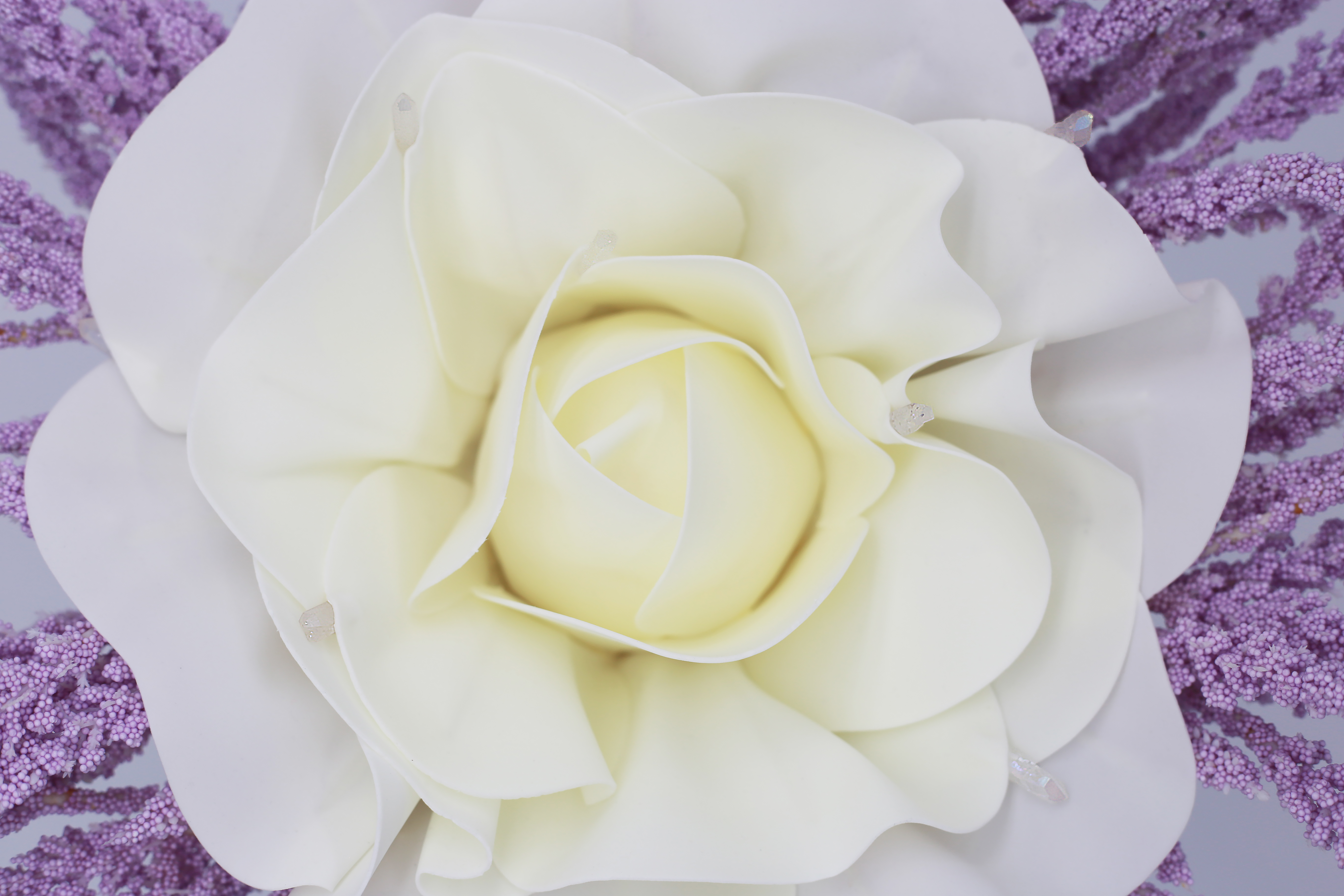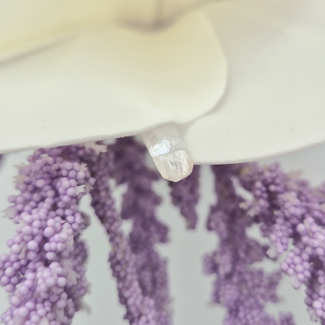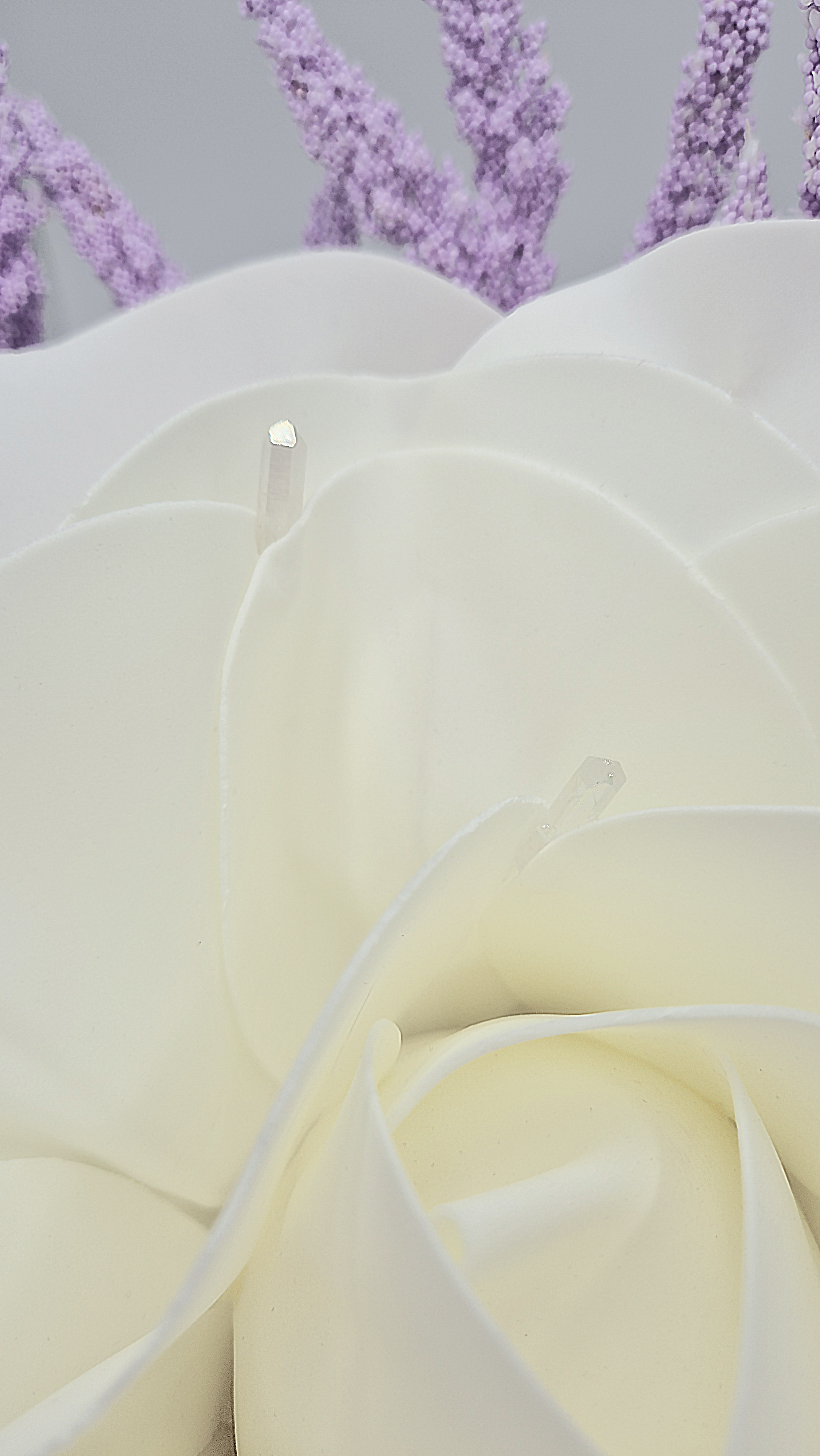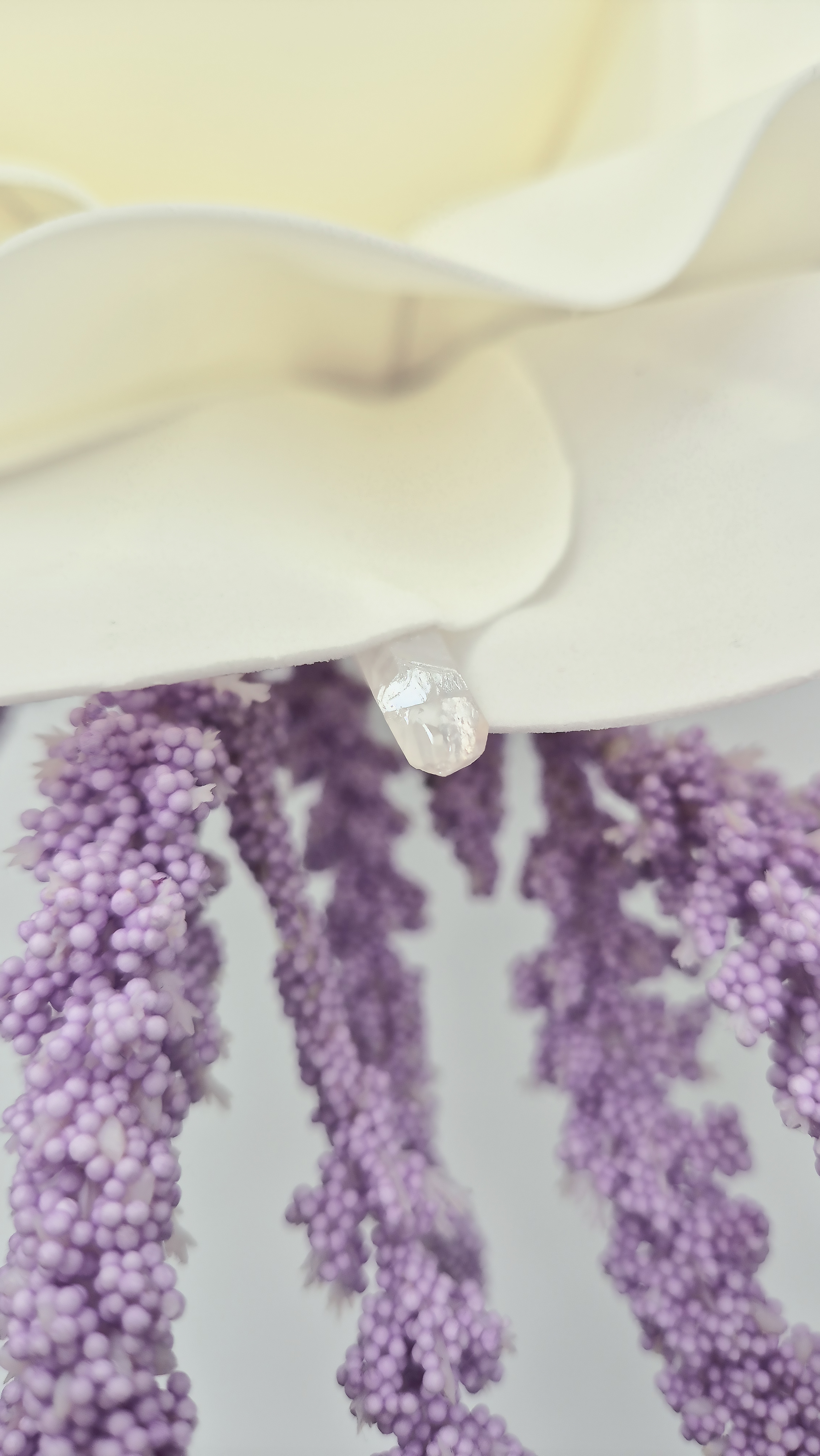 A „Monorózsa” egy különleges, kézzel készült díszcsokor, amelynek középpontjában egy látványos, szoborszerű óriás selyemrózsa áll. A pasztell lila árnyalatú mezei díszítés lágyan öleli körbe, míg a szirmok közé rejtett 8 darab szivárványfényű aurakvarc kristály titkos ragyogást és energetikai mélységet ad a kompozíciónak.