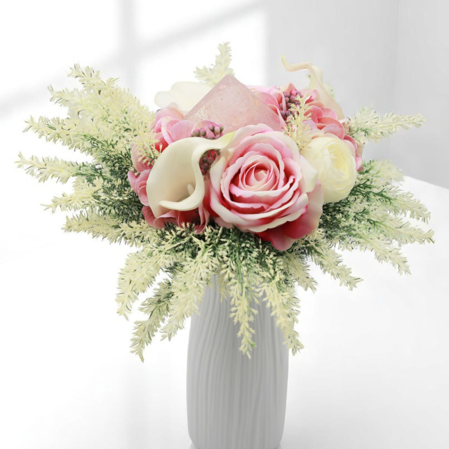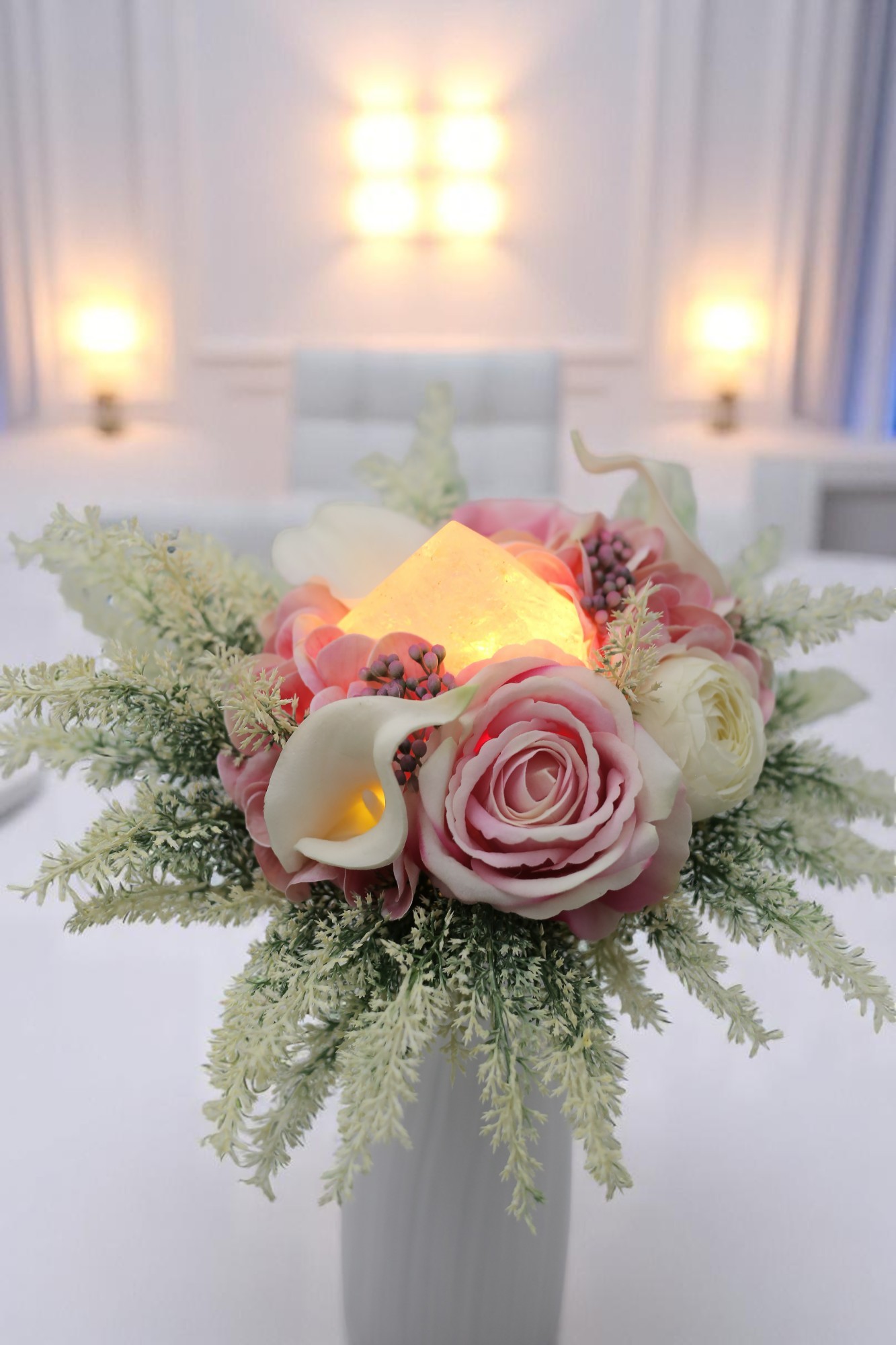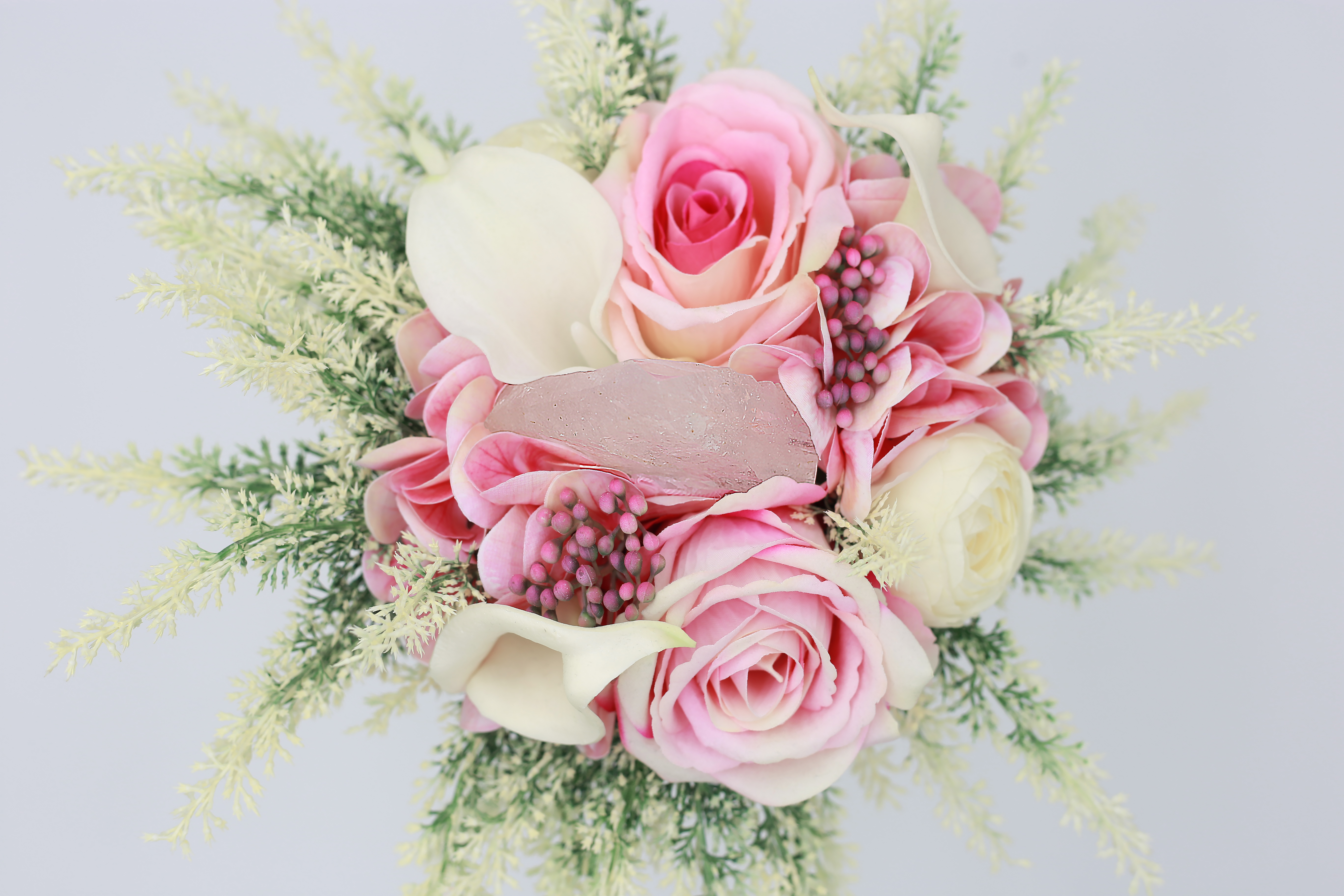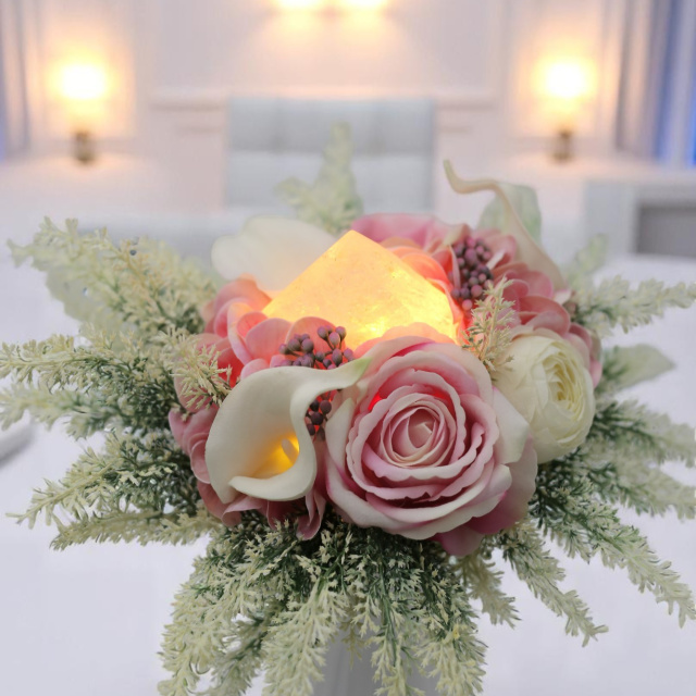A „Lélekfény” egy elegáns, magas minőségű élethű örökcsokor, amelynek lágy tónusú rózsái és kálái harmonikus egységet alkotnak a közepén elhelyezett, gombnyomásra világító girasol kristállyal.