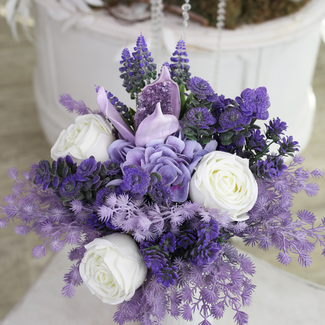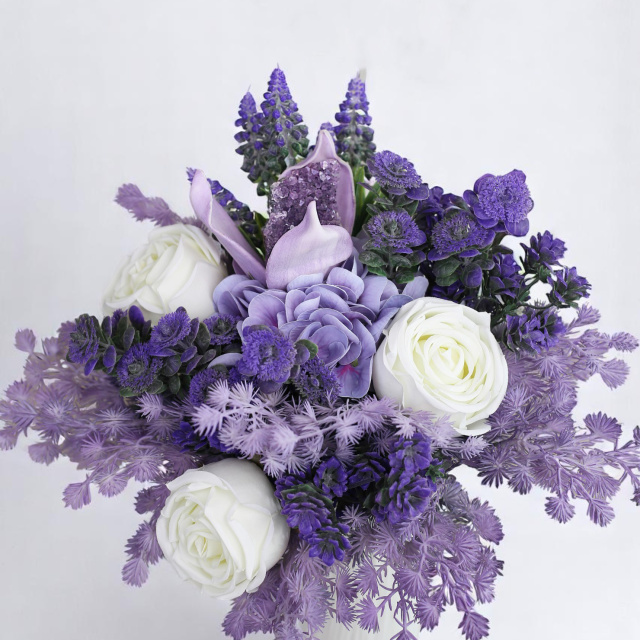 A „Rejtett Erő” egy harmonikus, mégis rejtélyesen vibráló selyemcsokor, amely a fehér rózsák tisztaságát, a hortenzia mélységét és a lila mezei virágok játékos textúráját ötvözi. A csokor szíve egy elegáns magnólia, mely belsejében egy csillogó ametiszt geoda rejlik – mintha egy titkos erőforrás bújna meg a szirmok között.