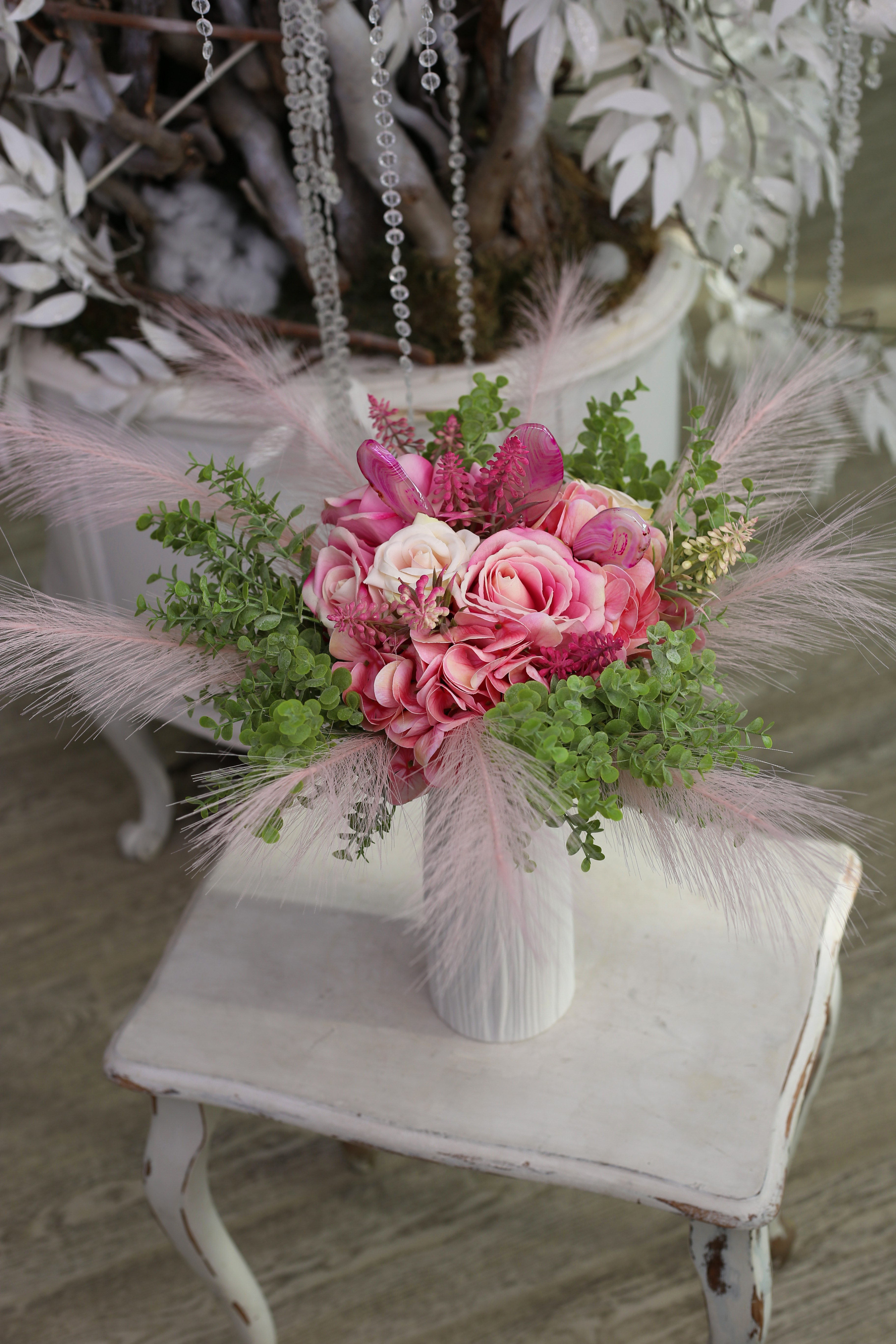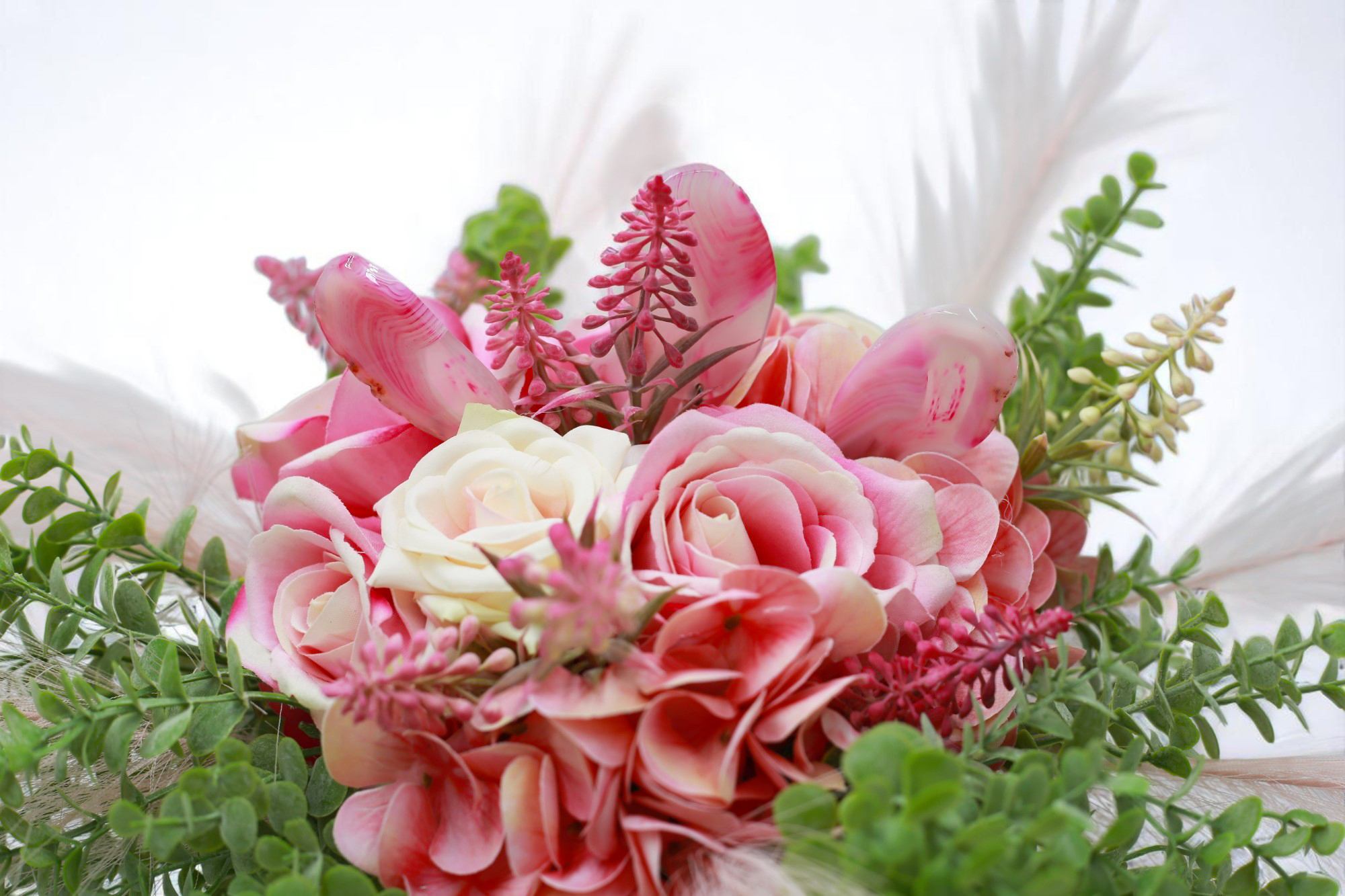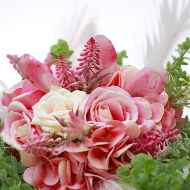 A pink achát különösen kapcsolódik a szívcsakrához – támogatja a szeretet áramlását, oldja a belső bizonytalanságokat, és fokozza az örömérzetet. Ez a csokor nemcsak látványos, de lelki töltettel is bír.
