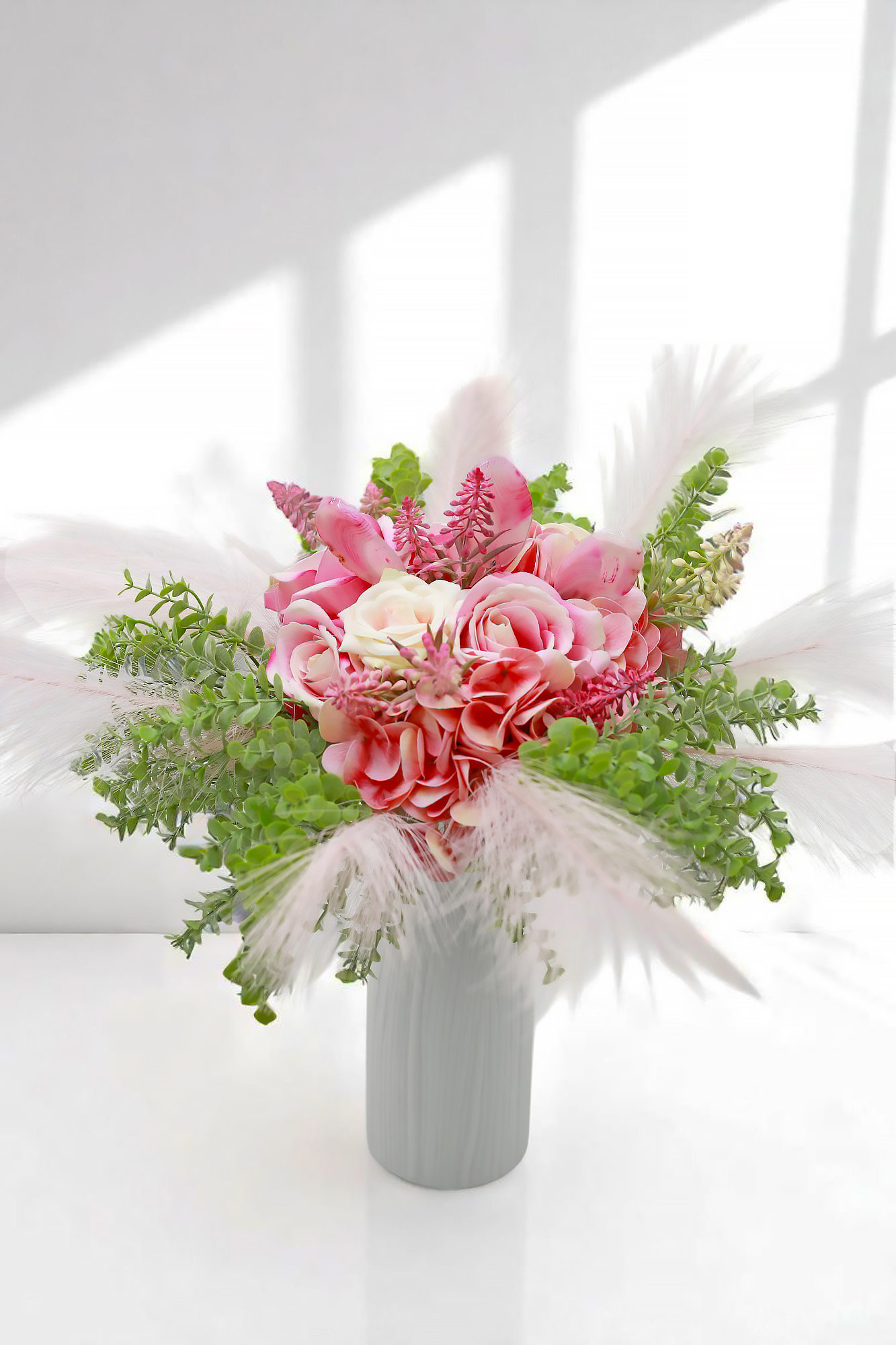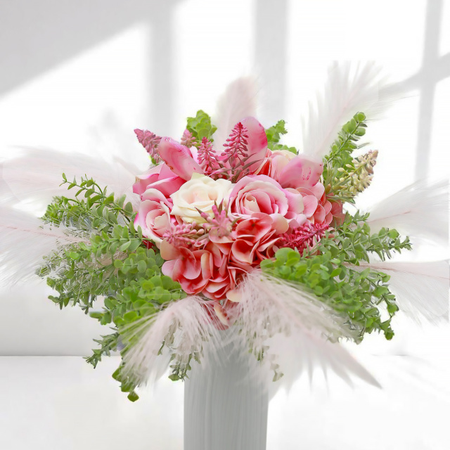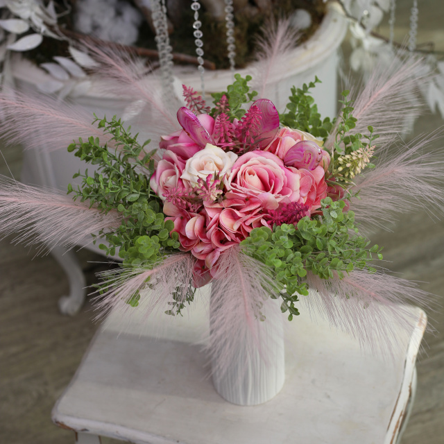 A „Szívsugár” csokor egy energikus, örömteli kompozíció, amely a tarka rózsák, púderes hortenzia és apró mezei virágok színkavalkádjával kelti életre a női érzékenység és önkifejezés szimbólumait. A csokor középpontjába helyezett három pink achát lap nem csupán látványelem: harmonizál, stabilizál és megerősíti az érzelmi biztonságot.