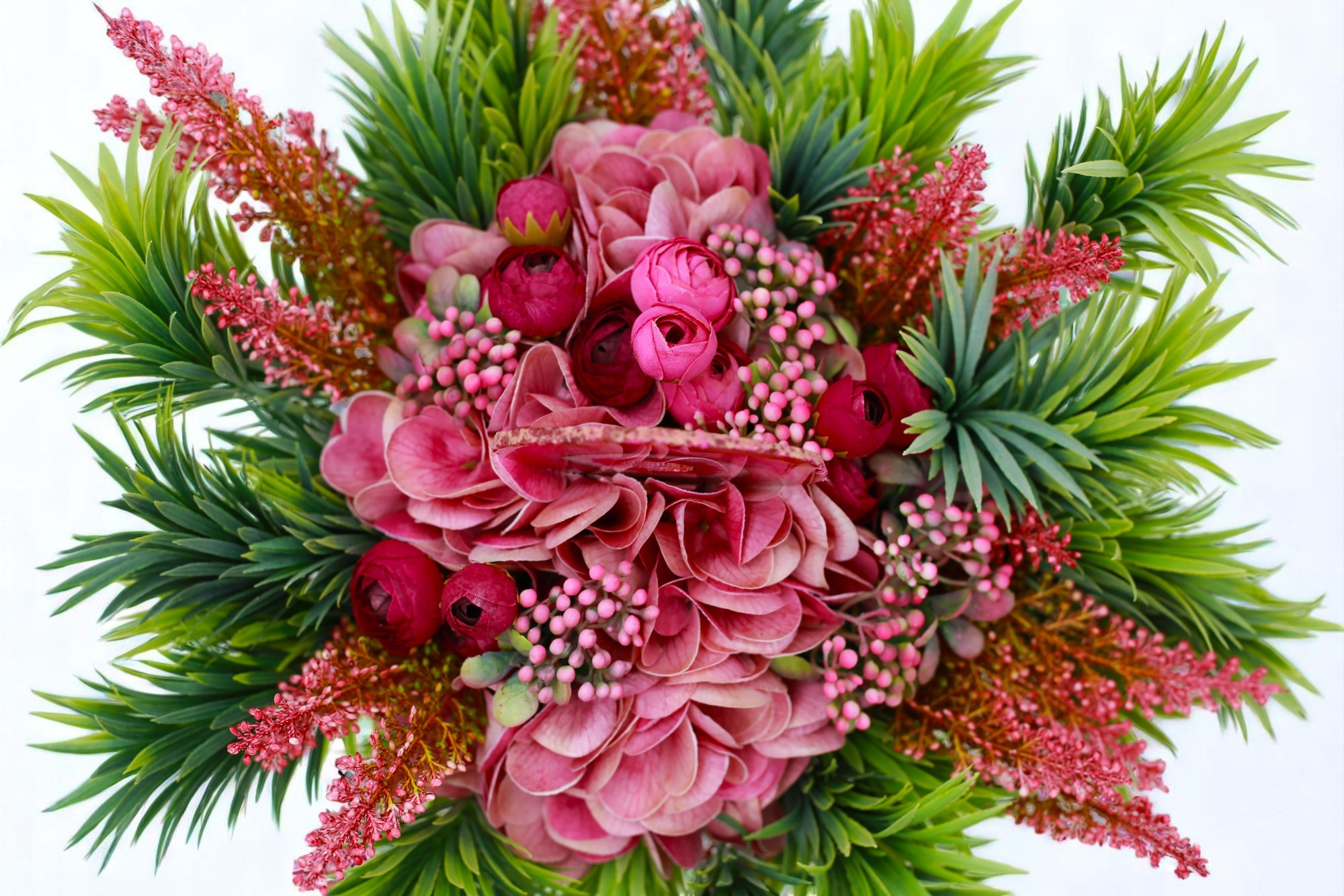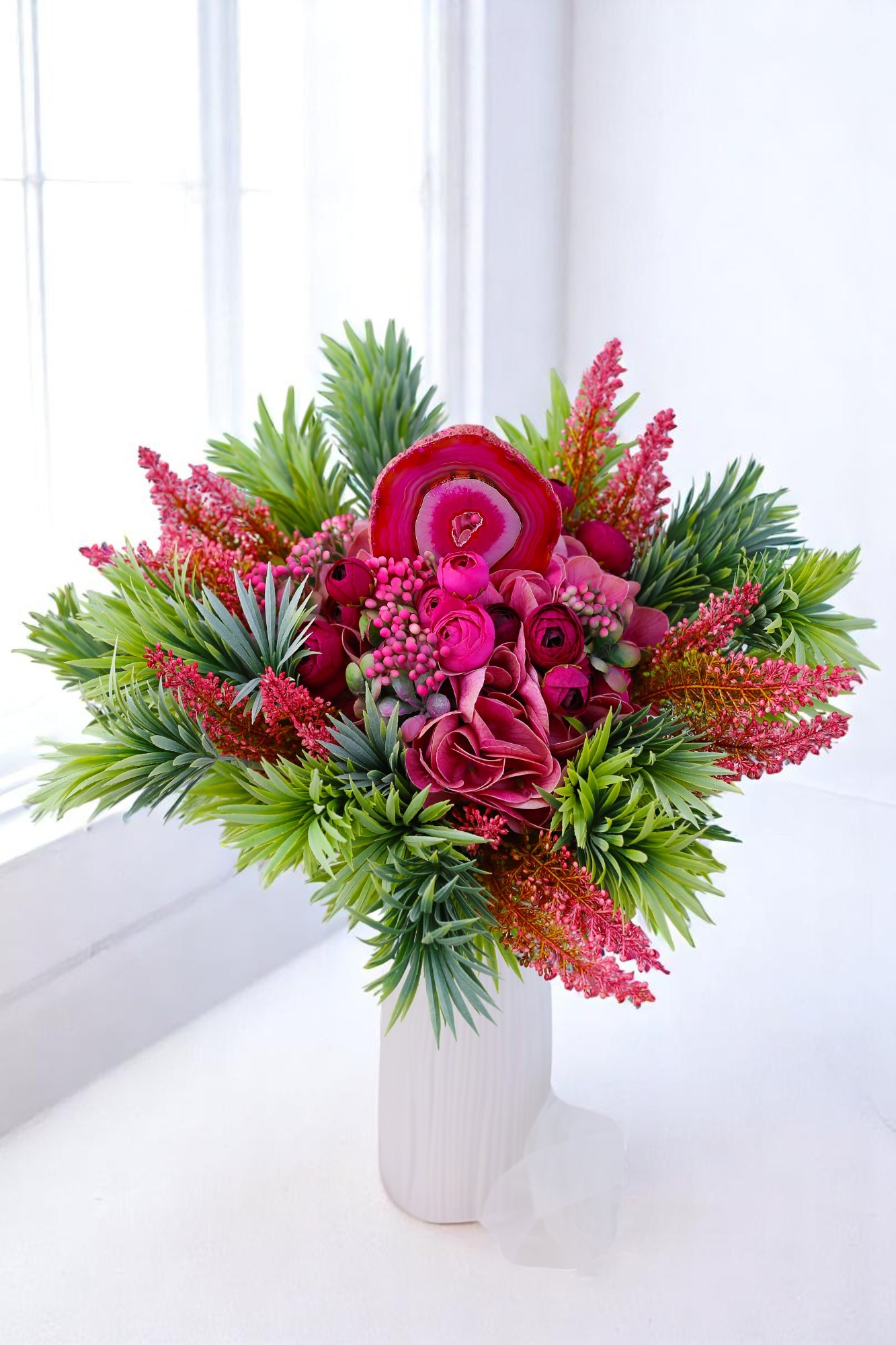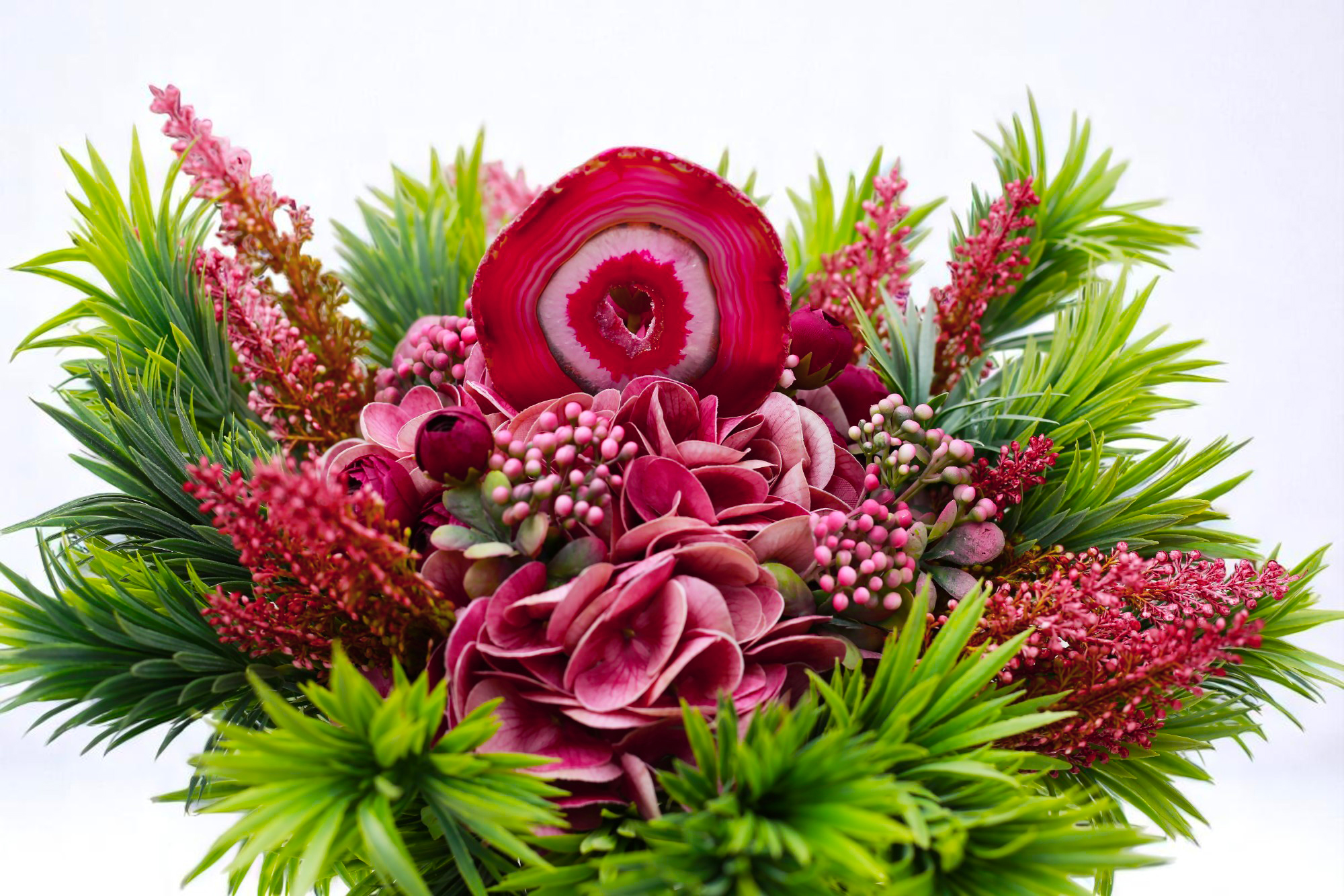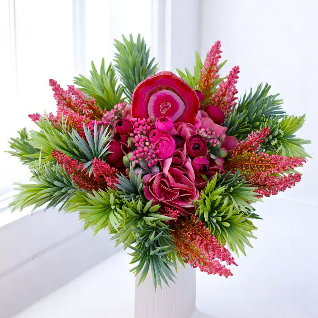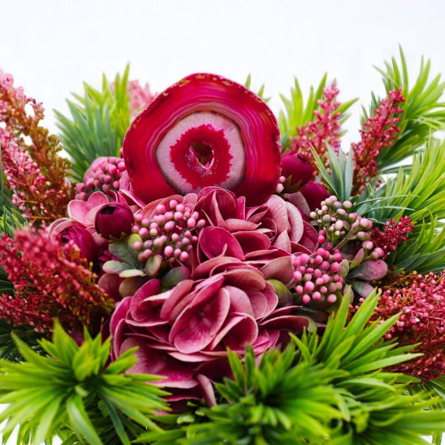 A „Trópusi Szív” egy karakteres, mégis elegáns selyemcsokor, amely a természet vad szépségét és a kristályok finom, belső erejét ötvözi. A pink és mályvás árnyalatú hortenzia, boglárka és bogyók buja zöldekkel vegyülnek, mintha egy egzotikus oázisbze csöppennénk. A csokor középpontjában egy különleges pink achát lap áll – vibráló színével és koncentrikus rétegeivel egyfajta energetikai szívdobbanásként pulzál.