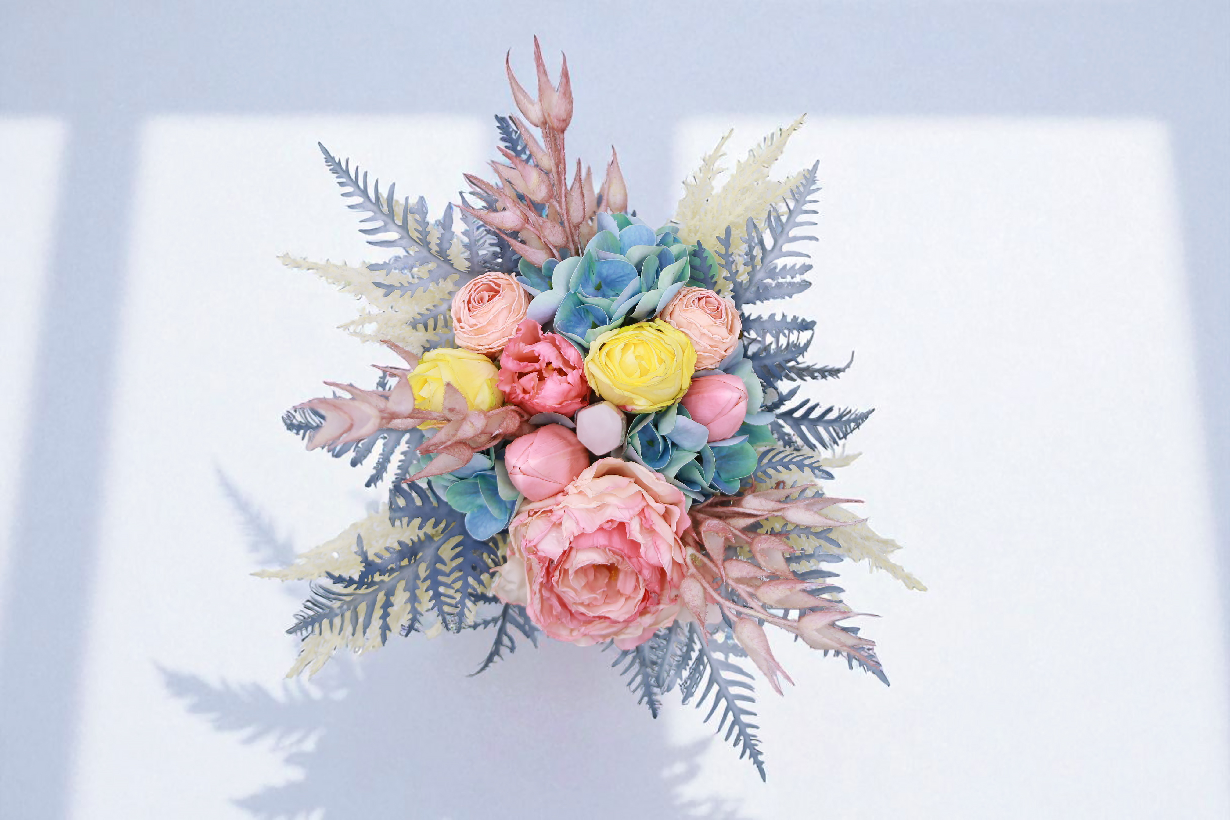A „Pasztell Álom” örökcsokor a finomság, a gyengédség és a szeretet színekbe öntött megtestesítője. A magasminőségű selyem peónia, rózsa, tulipán és hortenzia lágy árnyalatai egy harmonikus, álomszerű kompozíciót alkotnak, amely nem hervad el – így örökre megőrzi a pillanat szépségét.
