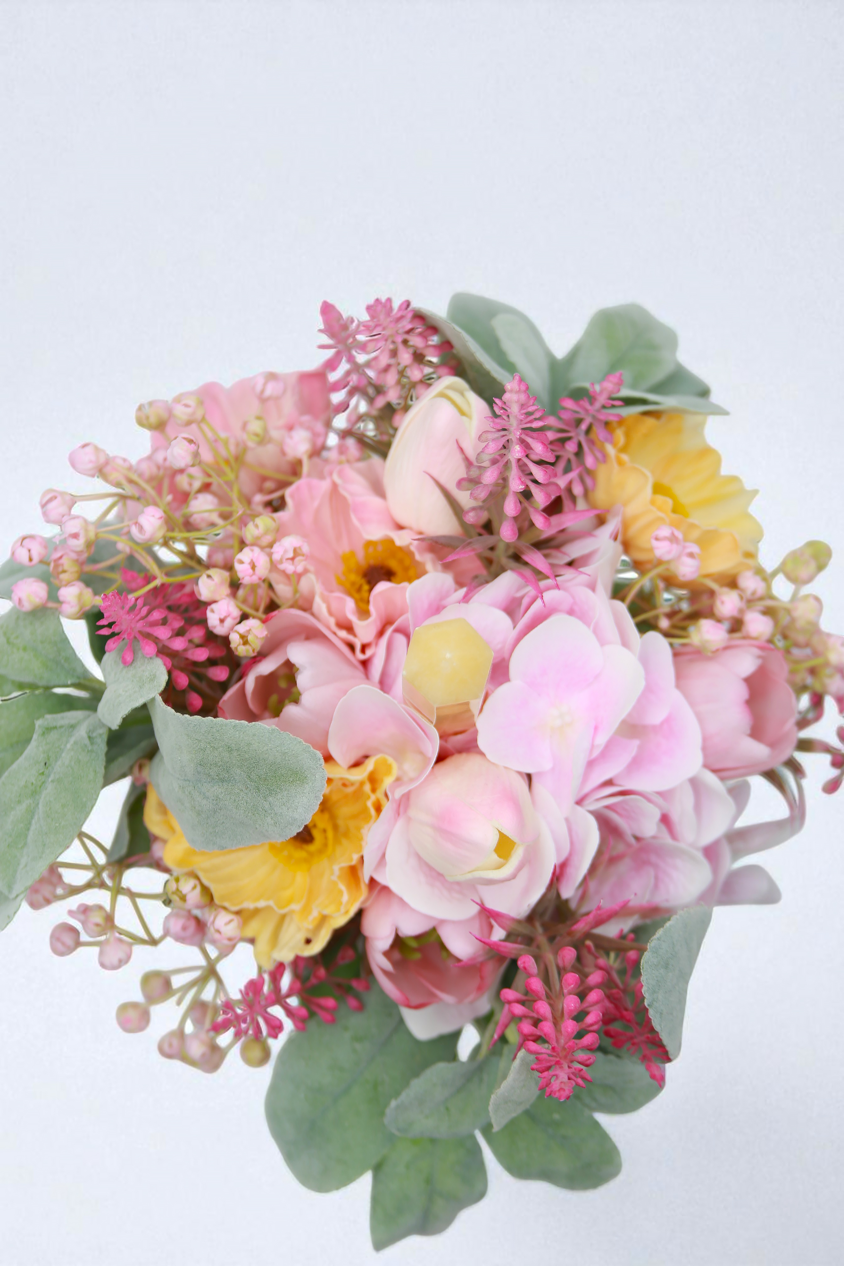 A „Nyárvarázs” örökcsokor a természet üde, pasztell tónusaiban szólal meg. A hortenzia, zsálya, pipacs, tulipán és apró mezei szirmok könnyed, friss és természetközeli hangulatot teremtenek. Ez a kompozíció soha nem hervad el, így örökké megőrzi a nyár tiszta, játékos energiáját.